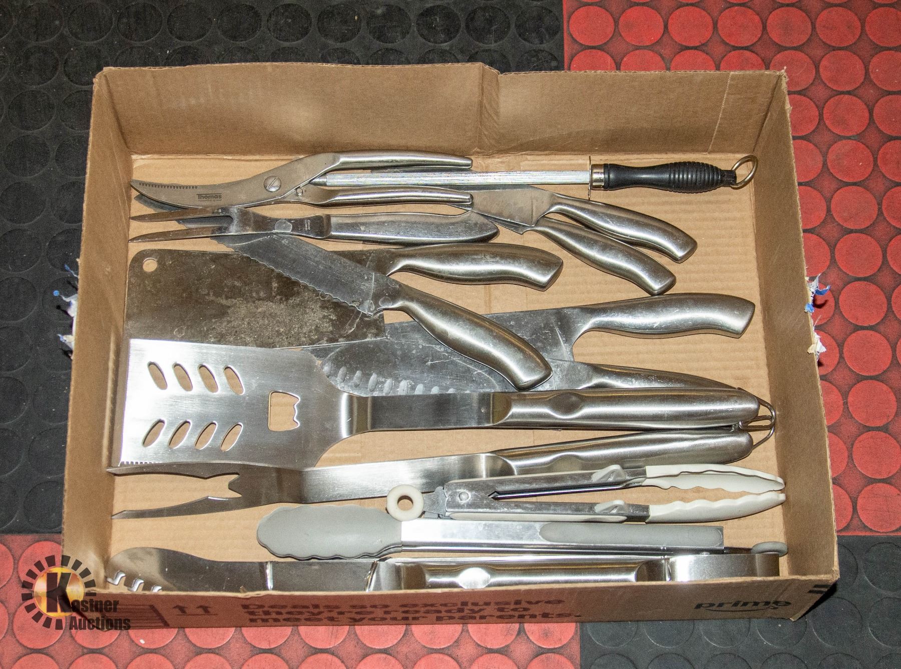 SET INCL. 3 SIZE OF TONGS, LARGE FORK AND SPATULA/KNIFE, THOMAS STAINLESS STEEL KNIVES INCL. BUTCHER, CARVING, BREAD, CHOPPING, HEAVY DUTY SCISSORS, ETC. **ALL ITEMS MUST BE REMOVED BY 5PM SATURDAY, DECEMBER 7TH 2024. ALL REMAINING ITEMS WILL BE SUBJECT TO A $6.00 PER DAY STORAGE CHARGE. ANY ITEMS REMAINING AFTER MONDAY, DECEMBER 23RD 2024 WILL BE CONSIDERED FORFEITED. NO REFUNDS WILL BE ISSUED FOR FORFEITED ITEMS. TO SCHEDULE A PICK UP APPOINTMENT CLICK HERE