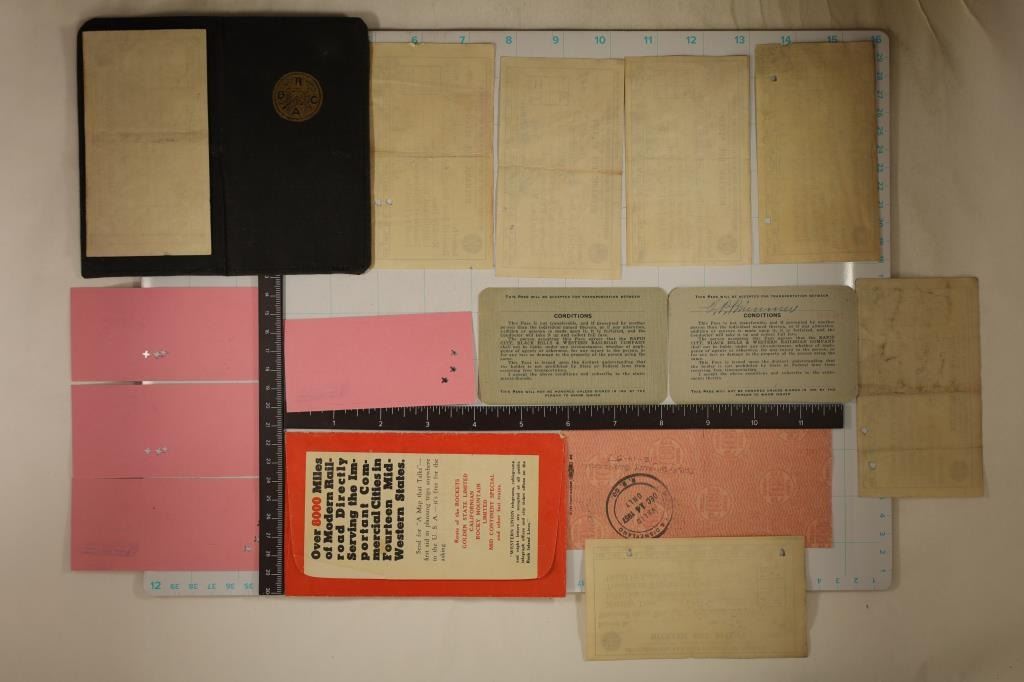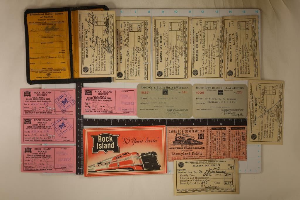 DUE RECIEPTS FROM THE 1940'S IN ORIGINAL BLACK FOLIO AND 7-VINTAGE RAILWAY TICKETS FROM THE 1920'S & 30'S. ROCK ISLAND ROCKET, SANTA FE AND DISNEY RAILROAD AND RAPID CITY BLACK HILLS AND WESTERN RAILROAD