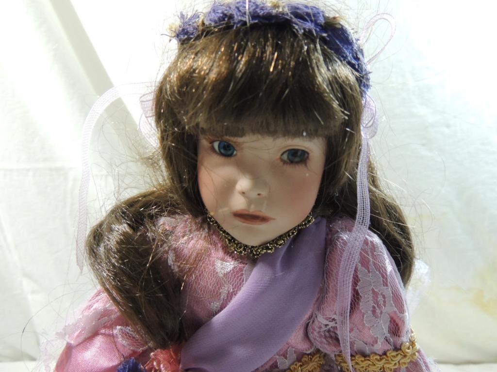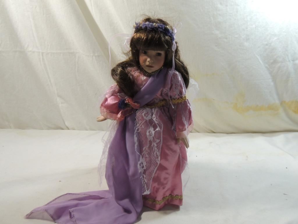 LONG BROWN HAIR BLUE EYES LACE DETAILS PORCELAIN DOLL, 14" TALL ON STAND BEAUTIFUL GOOD CONDITION COLLECTIBLE FROM PRIVATE DOLL COLLECTION. AS SHOWN SEE PHOTO FOR MORE DETAILS.