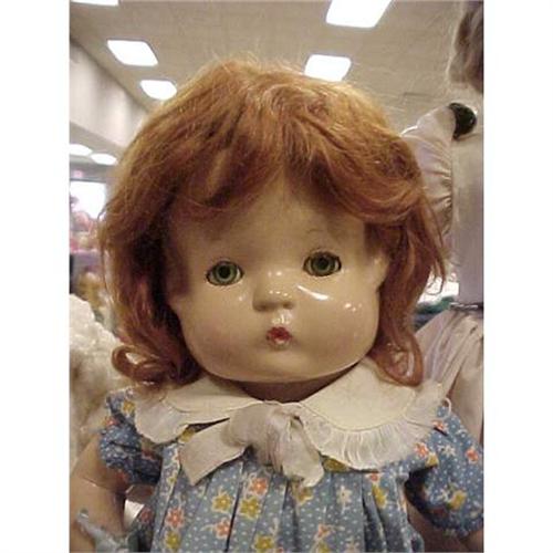 <table width="100%" border="0" cellspacing="0" cellpadding="4"><tr><td><em> </em></td></tr><tr> <td width="100%"> This composition 1928 Patsy is in remarkable condition. Her eyes and face color are good. A tiny spot of red is missing from the bottom lip but that is easily replaced. Her body is NOT peeling all over like so many Patsys do. She has a craze line in the crook of one arm, a finger was professionally repaired and a little paint is off from where the bracelet has rubbed. I would not call her mint but I would call her lightly played with. I think her wig, dress, onesy, shoes, socks, and Effanbee bracelet are all original. The dress is tagged . It may be slightly faded all over but not much. She is in very good condition. The only thing I would do is style her hair a bit--has some fly-aways. </td></tr><tr> <td> </td></tr><tr> <td>Reference #: Pat</td></tr><tr><td>Condition:very good</td></tr><tr><td>Year:1928</td></tr><tr><td>Country:USA</td></tr><tr><td>Maker:Effanbee</td></tr><tr><td>Height:14</td></tr><tr><td>Title:14" Patsy with red hair</td></tr><tr><td>Location:Sidney, Ohio 45365</td></tr></table>