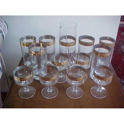 <table width="100%" border="0" cellspacing="0" cellpadding="4"><tr><td><em> </em></td></tr><tr> <td width="100%"> 14 Pc. Cocktail Set; 6-5.5" Glasses; 6--4" Stem glasses; 1" 8" Carafe with glass stirrer; gold pattern rims outside; b lue pattern inside ; all in excellent condition </td></tr><tr> <td> </td></tr><tr> <td>Reference #: pg__14__Disk_2_D</td></tr><tr><td>Condition:excellent</td></tr><tr><td>Year:1900's</td></tr><tr><td>Country: USA</td></tr><tr><td>Height:8"Carafe;4" stem glasses</td></tr><tr><td>Weight:15 lbs.</td></tr><tr><td>Title:14 Pc. Cocktail and/or Beverage Set</td></tr><tr><td>Type:Gold rims outside</td></tr><tr><td>Location:Shaftsbury, Vermont</td></tr></table>