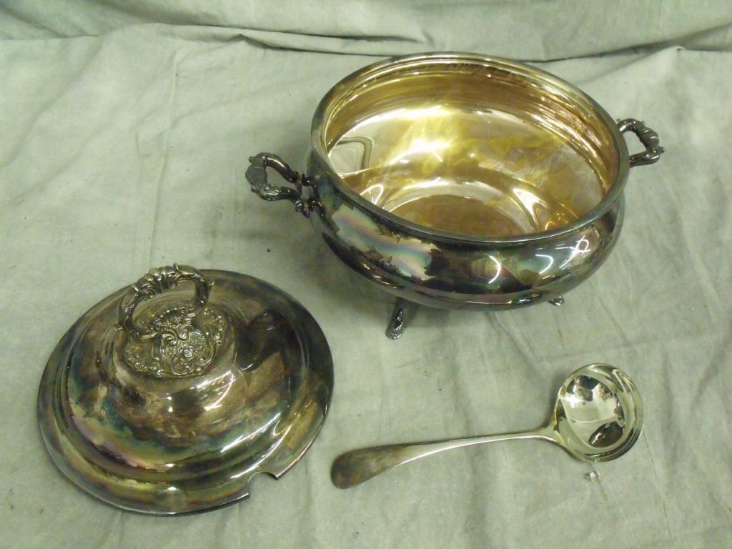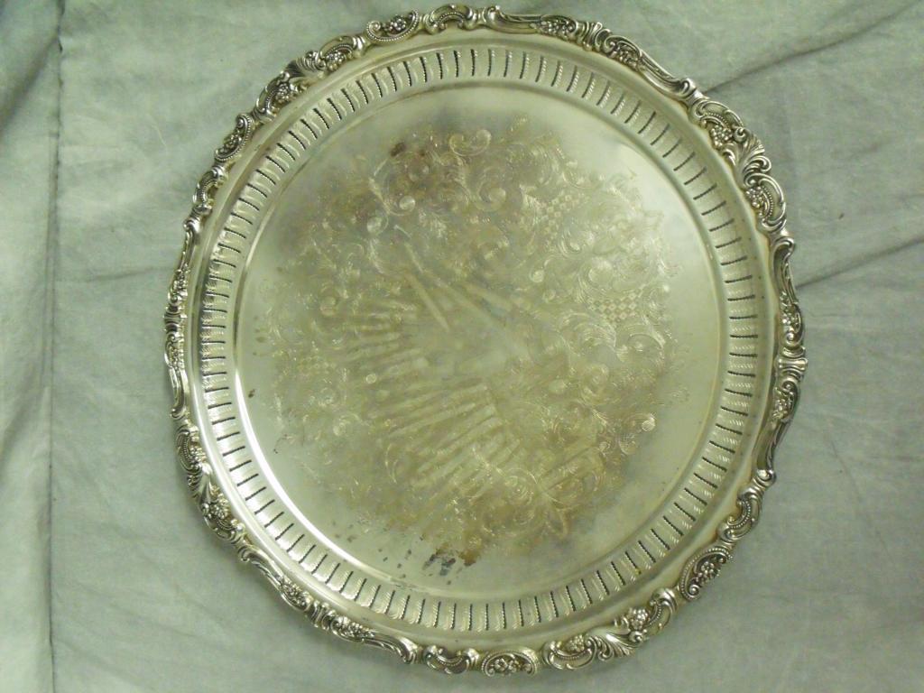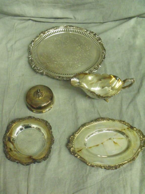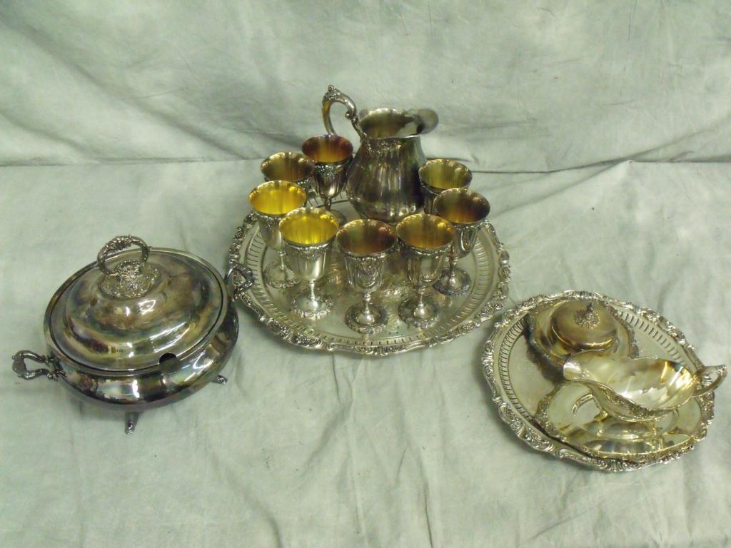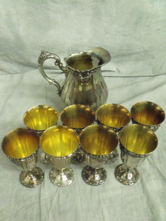 Including 8 wine goblets marked on the bottom with baroque pattern, pitcher also marked on bottom 9" tall, 2 round serving trays 18" and 14" in diameter, gravy dish, butter dish, serving dish with spoon. All are in good condition.