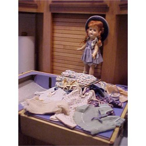 This adorable doll is either unmarked Arranbee composition Nancy or Nancy Lee. She has clean composition with no craze lines on her face that I can see...amazing face! The body has some very fine craze lines. She has blue-green tin sleep eyes which still have their original eye lashes. She has an auburn mohair wig and braided in it's original set. The outfit she is pictured in has a hat and onesie, with blue leather shoes and cream socks--originally what she came in. Socks are a little discolored. The clothing and doll were lightly played with, so all is not factory perfect but still very nice. The doll makes a very cute presentation! I did find a raised number "13" on the back of her torso, typical of Arranbee dolls. I see no big craze lines, lifting or detracting marks or damage. She has various outfits including tennis dress and racket, sleepwear, skates and dresses plus other items. All have been played with but are in fairly good condition.