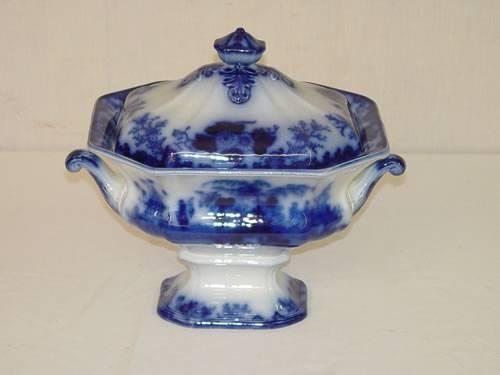 14" SCINDE FLOW BLUE 2 PC. PEDESTALED SOUP TUREEN (BASE & COVER) BY ALCOCK - REPAIR TO LID & BASE;