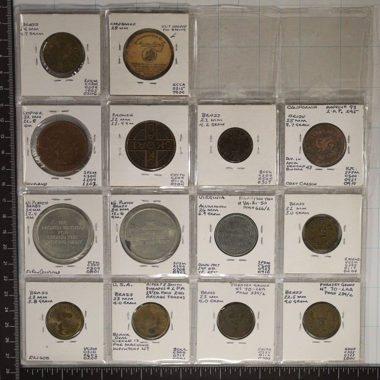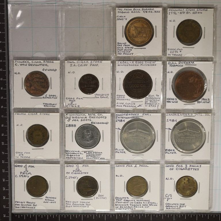 DURHAM, PENNANT CIGAR STORE, PIONEER CIGAR STORE, OWL CIGAR STORE, SKOAL, PALACE CIGAR STORE, P. WHITLOCK MFG CO. SMOKENDERS INC, GOOD FOR 1 PACK CIRCA 1930'S FOR COUNTER TOP MACHINE, PAY OUT MACHINE TOKEN CIRCA 1940'S 1