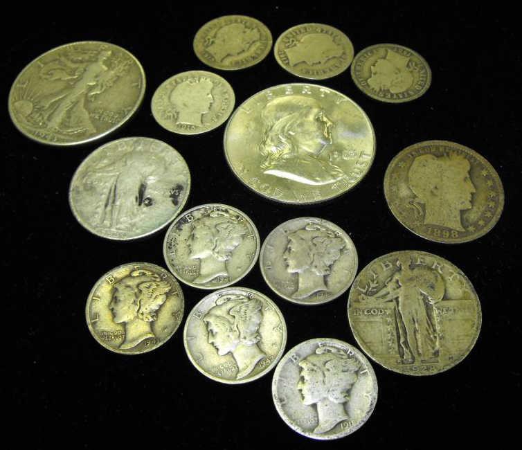 (3) 90% Halves- 1 WL-1 Franklin- (3) 90% Quarters- 2 SL- 1 Barber- (9) 90% DImes- 4 Barber-5 Mercury- Coin dates will vary- You will receive the total coins you see in the picture. They may be different dates and grades.