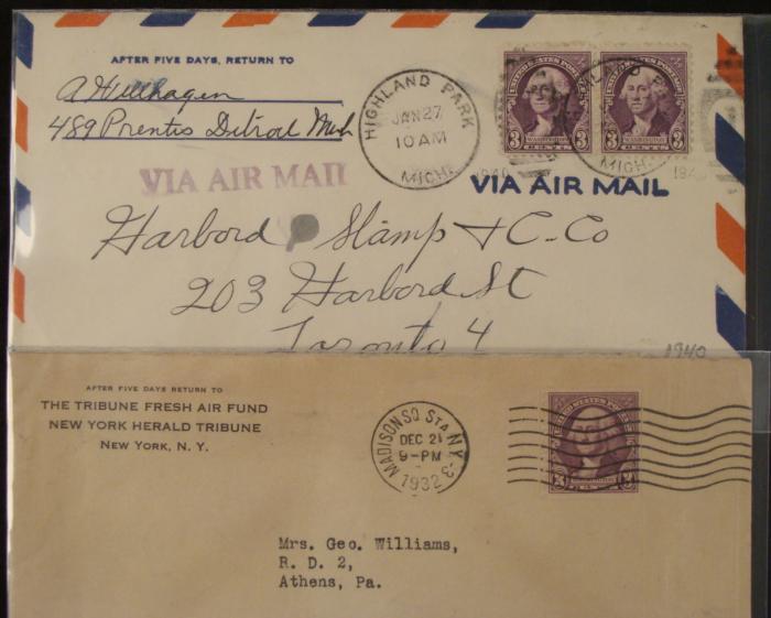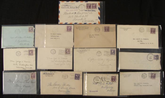 This is a group of 14 early George Washington 3 Cent stamps, all on envelopes which total 13. One has 2 stamps. There are several types here. There are a variety of postmarks from around the country, , dating from about 1917-49. All are in plastic sleeves, and in very good condition overall.