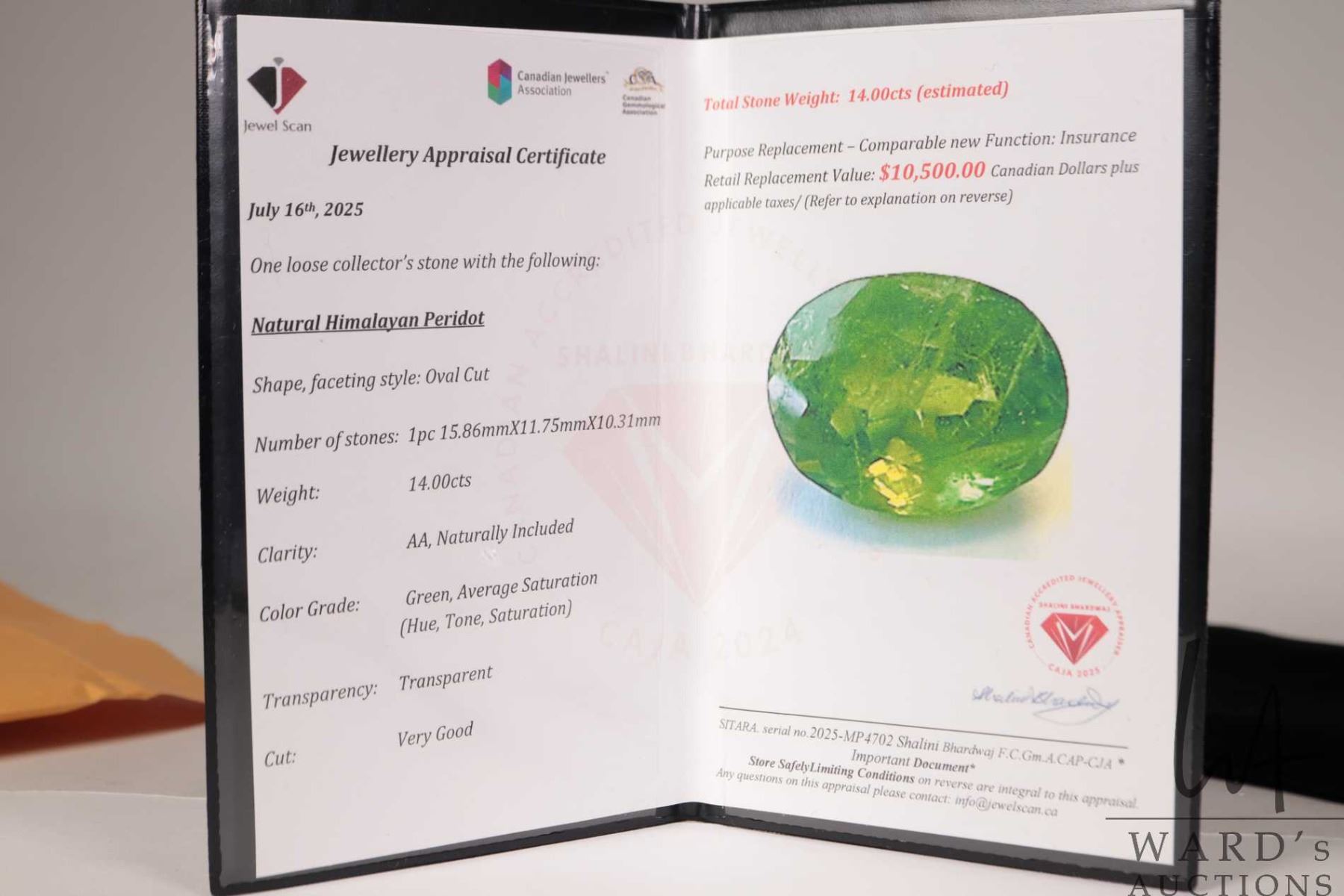 14 ct Certified Green Peridot gemstone, Certificate provided by consignor