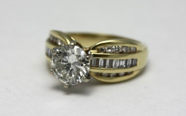 Approx. 6.3 dwt. K-I2. Center stone approx. 2.50 dwt. Side stones approx. 1.20 ct. Approx. 3.70 total ct. Size 9 1/2. (4132)