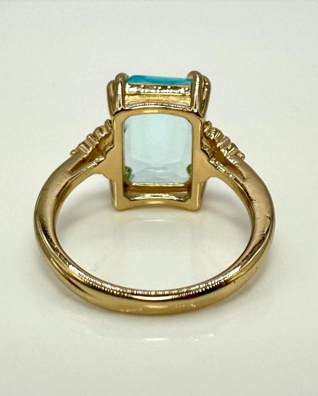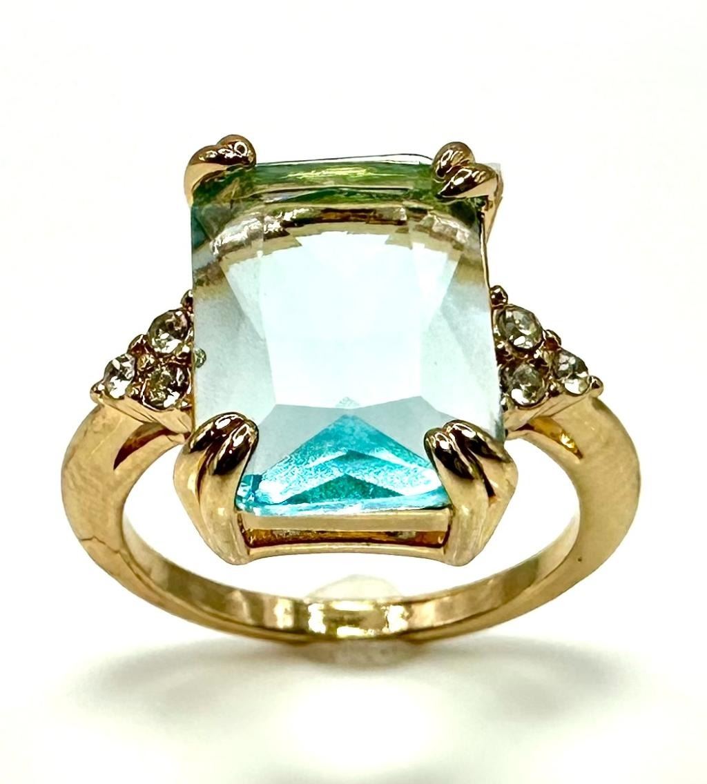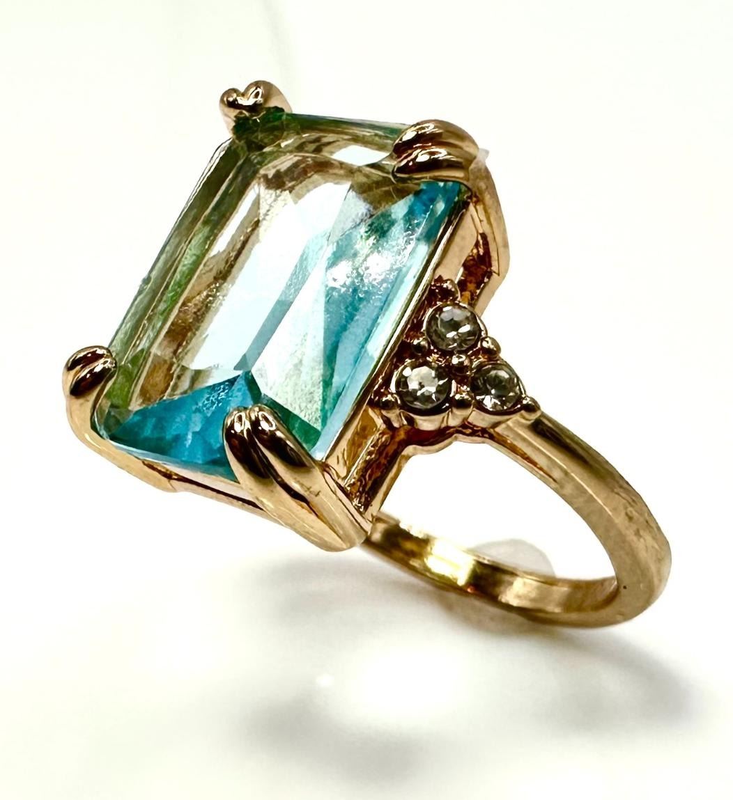 Breathtaking 6.5 Ct Sky Blue Lab Simulated Blue Topaz Ring, This Sky-Blue Topaz is an Eye-Clean Emerald Cut measuring 10 x 14 mm. It is mounted in elaborately designed 14 K yellow Gold over solid .925 sterling silver size 7. The total gram wt. is 3.5 grams.