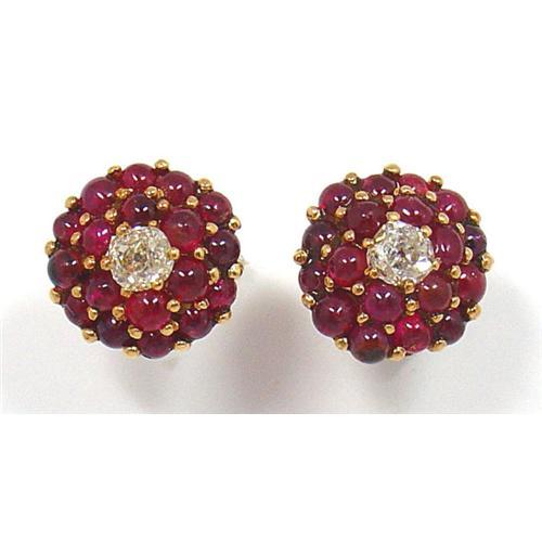 </font></strong>The 14 Kt pink gold button earrings are pave set with cabachon rubies. At the center is a