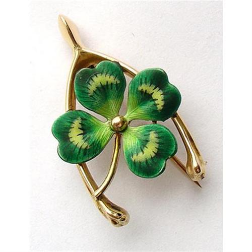 This delightful good luck pin displays a green enameled four-leaf clover whose stem is affixed to a gold wishbone. The clover leaves are highly detailed with black on shades of green. The C-clasp is marked 14K. 1.25" x 0.75" (3cm x 1.9cm)