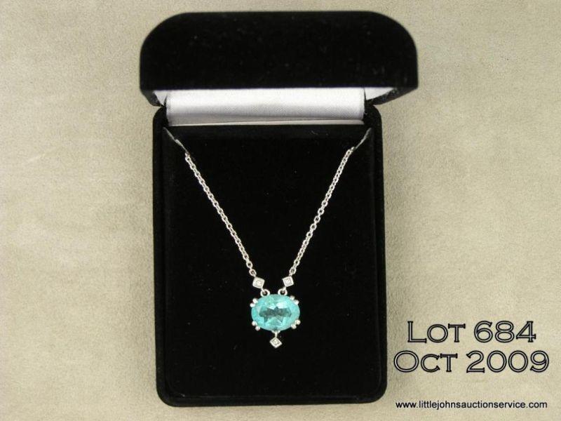 14 kt white gold emerald pendant, 8 grams, set with one oval emerald weighing 6.3 carats further accented with 3 full cut diamonds having a total weight of approx. 0.15 carat. Est. $250 - $500