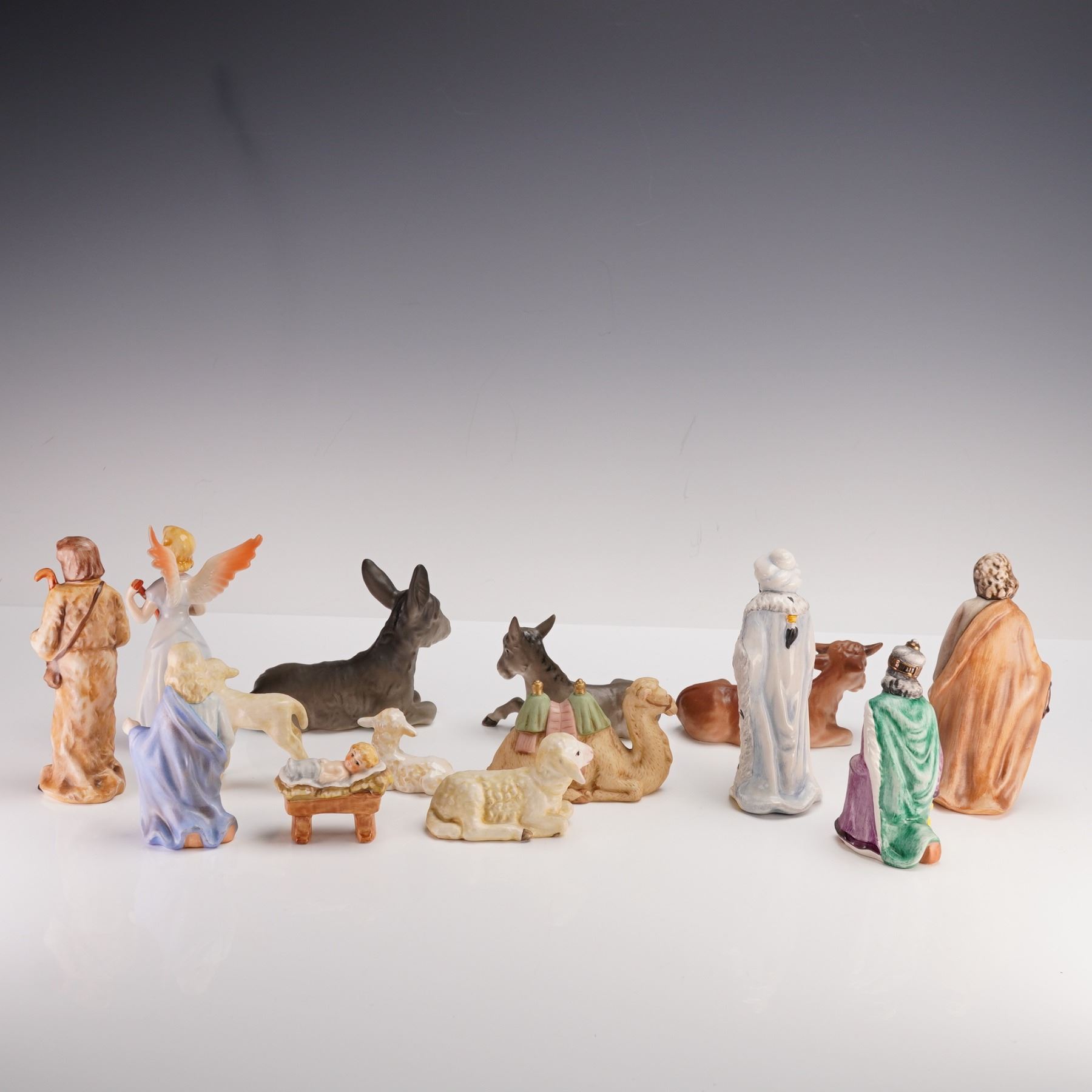 A finely crafted porcelain nativity collection made in West Germany by Goebel, featuring hand-painted figures depicting the traditional Christmas scene. The set includes Mary kneeling beside the infant Jesus in a manger, Joseph holding a staff, an angel with a harp, three wise men in regal attire bearing gifts, a shepherd with a lamb, and a selection of animals including a donkey, ox, camel, and two sheep. Each figure bears the blue Goebel W. Germany backstamp on the underside, with some pieces also marked with logos. Model numbers such as HX 28 and others are impressed on the bases.