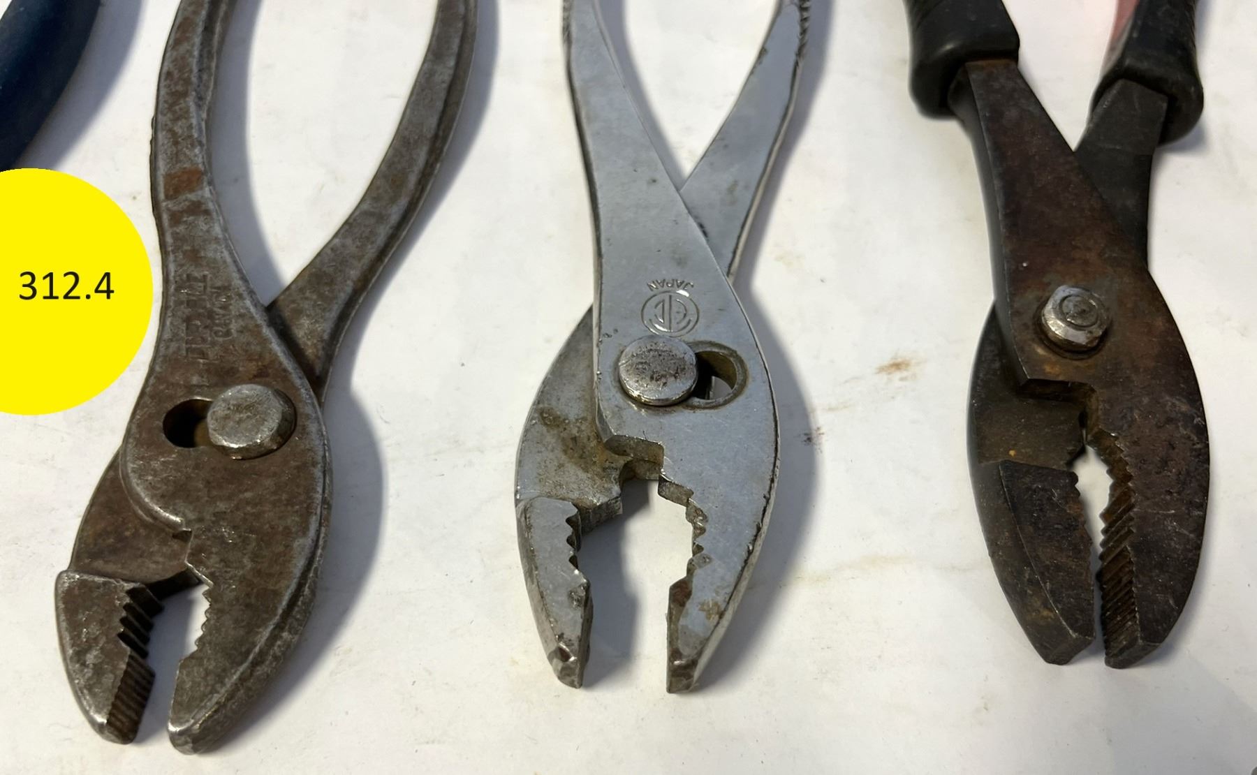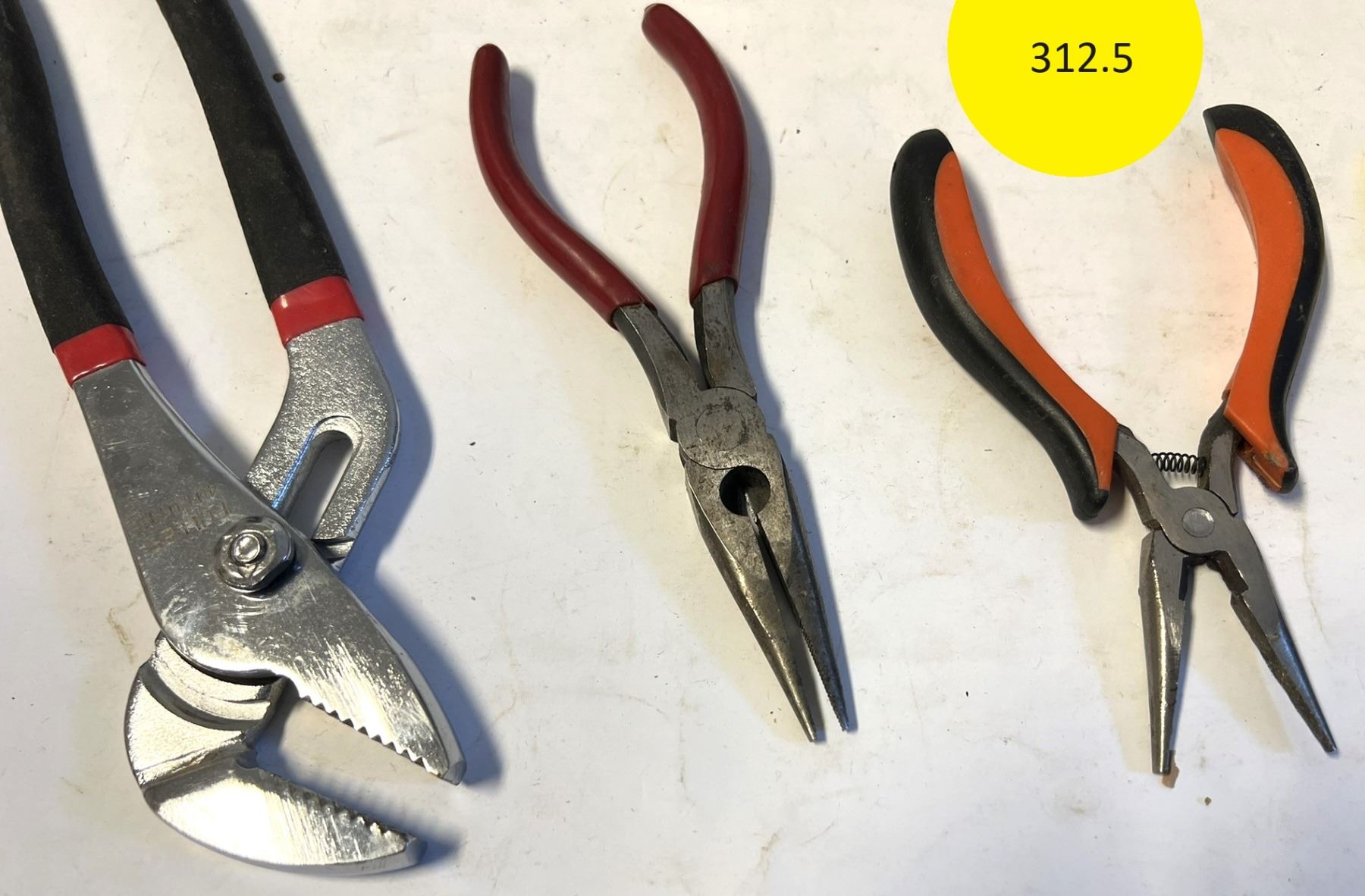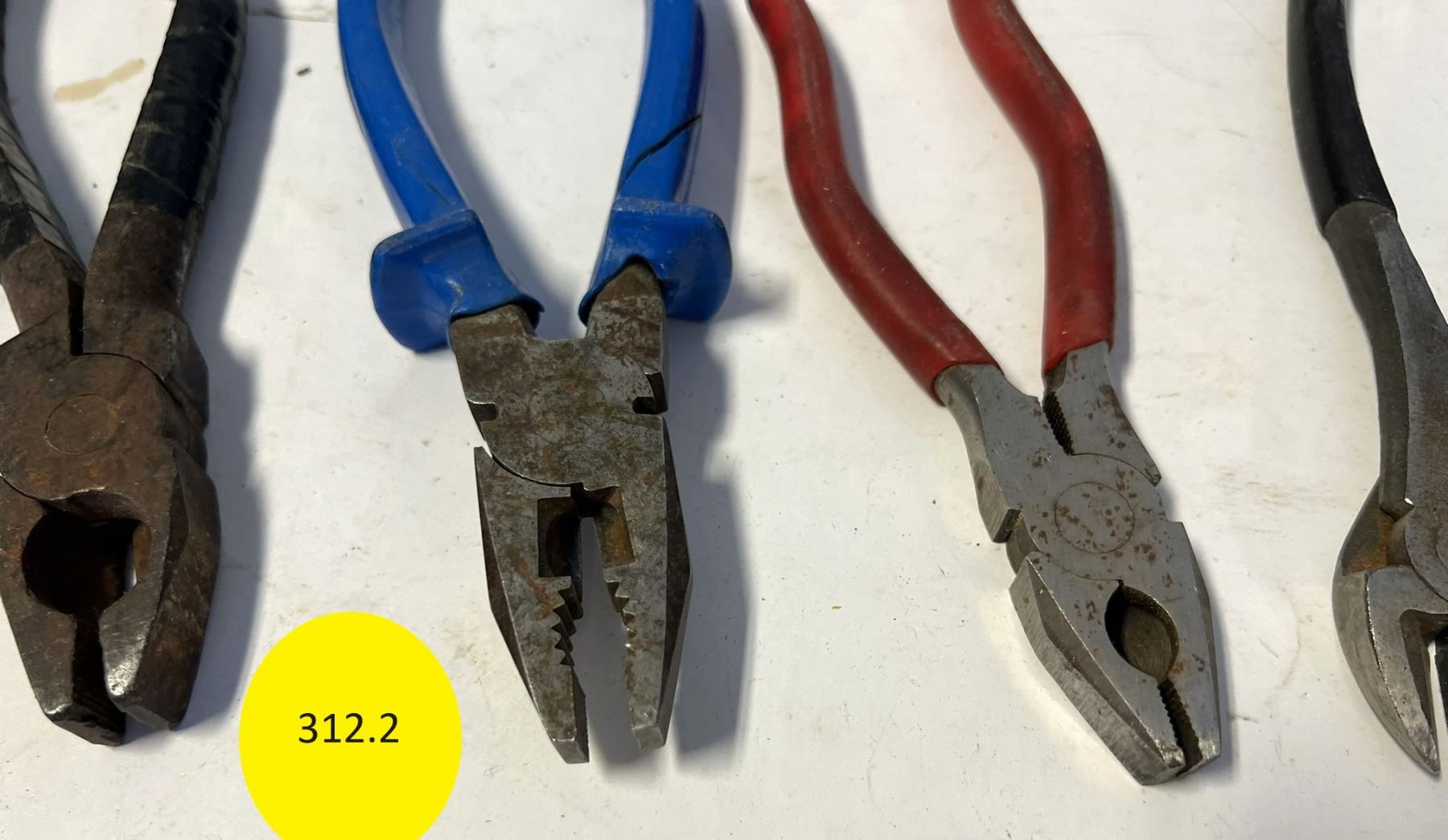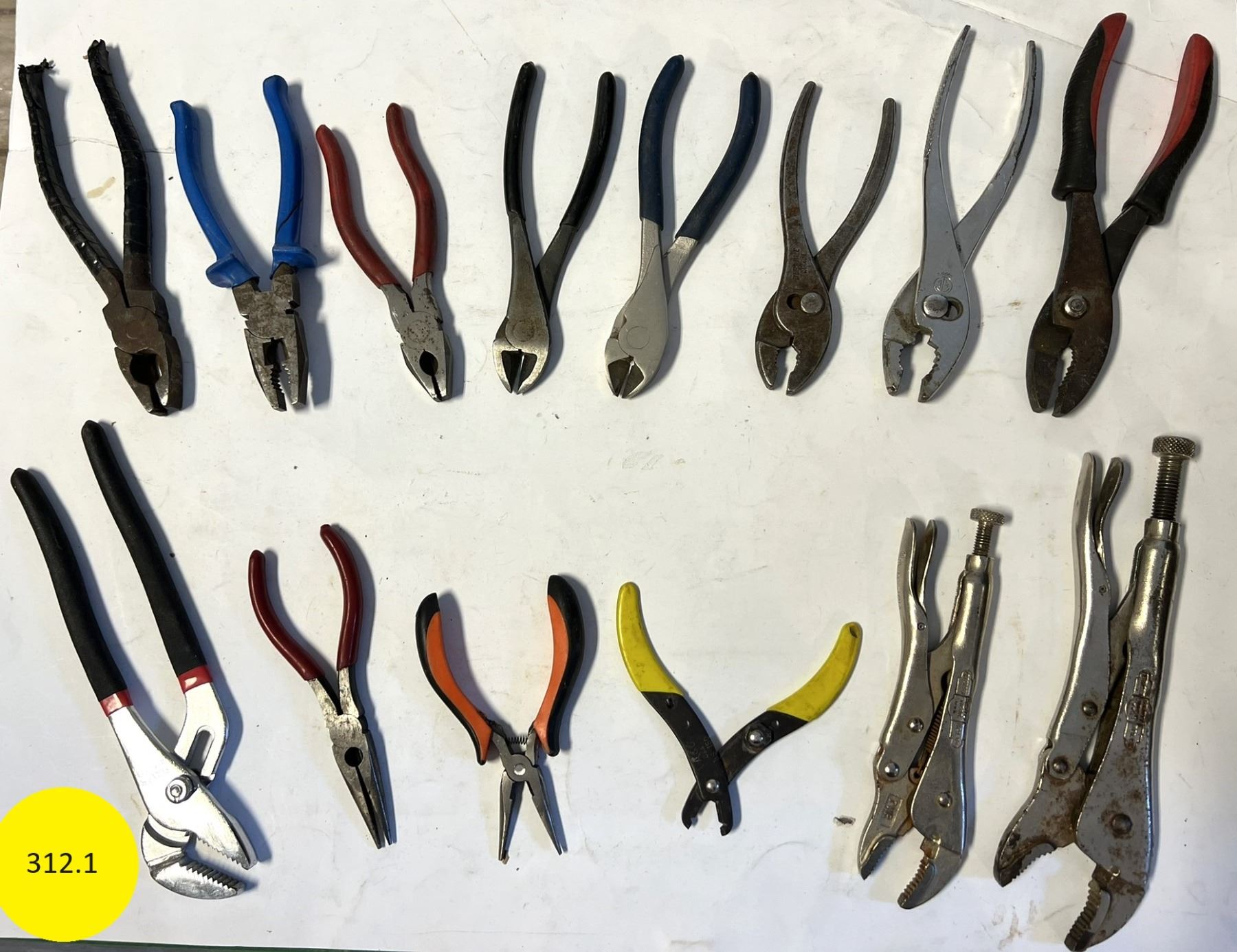 Contains: (3) Linesman, (2) Diagonal cutters, (3) Slip joint pliers, (1) Adjustable "Channellock type", (2) needle nose, (1) wire cutter (2) Vice grip type.