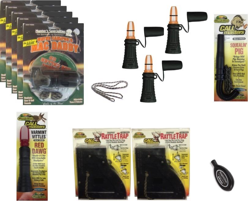 14 x Hunting Calls & 1 Lanyard, 5-Miss Mac Daddy Cow Call, 3-Imaka Da Bullcrazy, 2-Squealin Pig, P.A.W.S. Red Dawg, Mouse Squeaker, 2-Trophy Rattle Trap, Single Lanyard