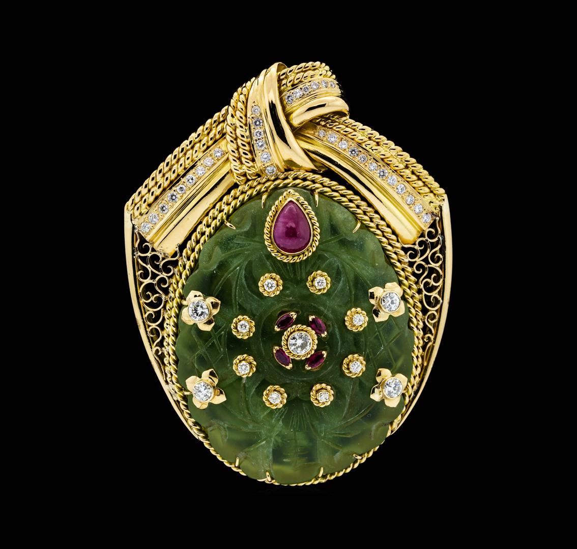 One electronically tested 18-22KT yellow gold lady's hand fabricated fashion pendant-pin with a bright polish, hand-engraved detail ?nish. Condition is like new, good workmanship. Containing: One bezel set pear cabochon cut natural ruby, measuring 8.60 x 6.20 x 3.60mm, (depth est.) approximate weight of 2.07ct., clarity is heavily included, medium dark, moderately strong, red color, (GIA R 6/4), cut is good. Transmitting light somewhat diffusely, semi-transparent to translucent. Naturally occurring internal & external characteristics are present. Indications of laboratory high temperature heat treatment. Colored gemstones are presumed to have been subjected to commonly used enhancement processes. Graded in the setting. Four prong set marquise modified brilliant cut natural rubies, measuring 3.50 x 1.80 x 1.17mm, (depth est.) approximate total weight of 0.24ct., clarity is eye clean, medium dark, moderately strong, slightly purplish red color, (GIA slpR 6/4), cut is good. Transmitting light with a minimum of distortion, transparent. Colored gemstones are presumed to have been subjected to commonly used enhancement processes. Graded in the setting. Five bezel set round brilliant cut diamonds, measunng 3.40 - 3.30 x 2.08mm (depth est.) approximate total weight of 5 Stones = 0.72ct. Graded in the setting VS-2 to Si-1 Color G - H Cut Good Thirty-three bead set round brilliant cut diamonds, measuring 1.80 - 1.70 x 1.09mm (depth est.) approximate total weight of 33 Stones = 0.67ct. Graded in the setting. Clarity VS-2 to SI-1 Color G - H Cut Good. Eight bead set round brilliant cut diamonds, measuring 1.50-1.30x0.84mm (depth est.) approximate total weight of 8 stones = 0.06ct. Graded in the setting. Clarity VS-2 to SI-1. Color G - H Cut Good. One prong set carved jadeite measuring (49.20x39.40) 9.81mm, approximate weight 140.00ct. good spinach green with light tone, virtualy no inclusions, near transparent, good poportion, very very high demand in size, medium polish and medium finish. Graded in the setting. Total weight of colored stones 2.31ct. Total weight of diamonds 1.45ct. Total weight of jade 140.00ct. Total weight of pendant-pin 59.50gm. Total estimated retail value $12,430.00 GAS Appraised.