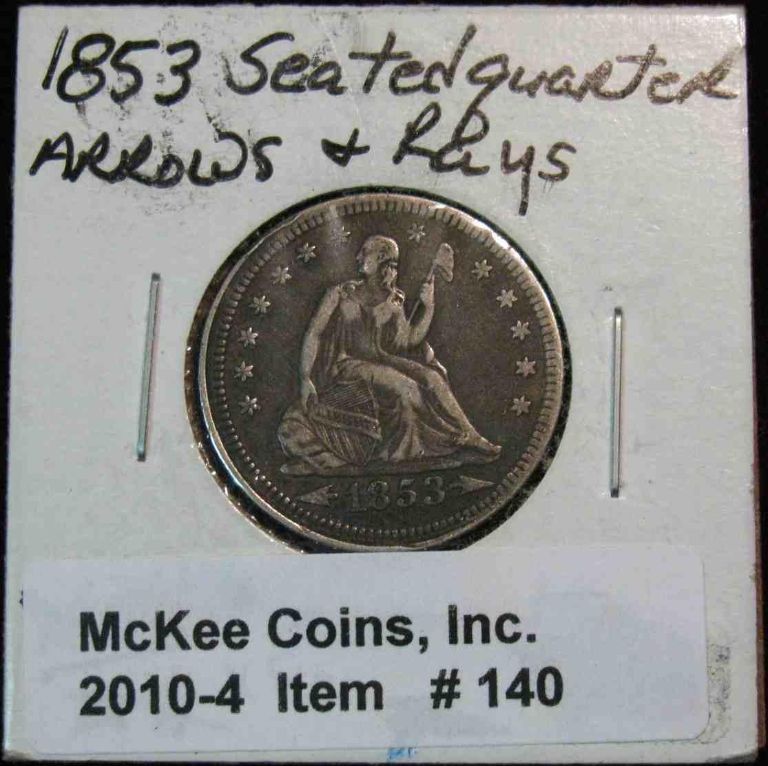 140. 1853 Arrows & Rays Seated Liberty Quarter. VF-EF.
