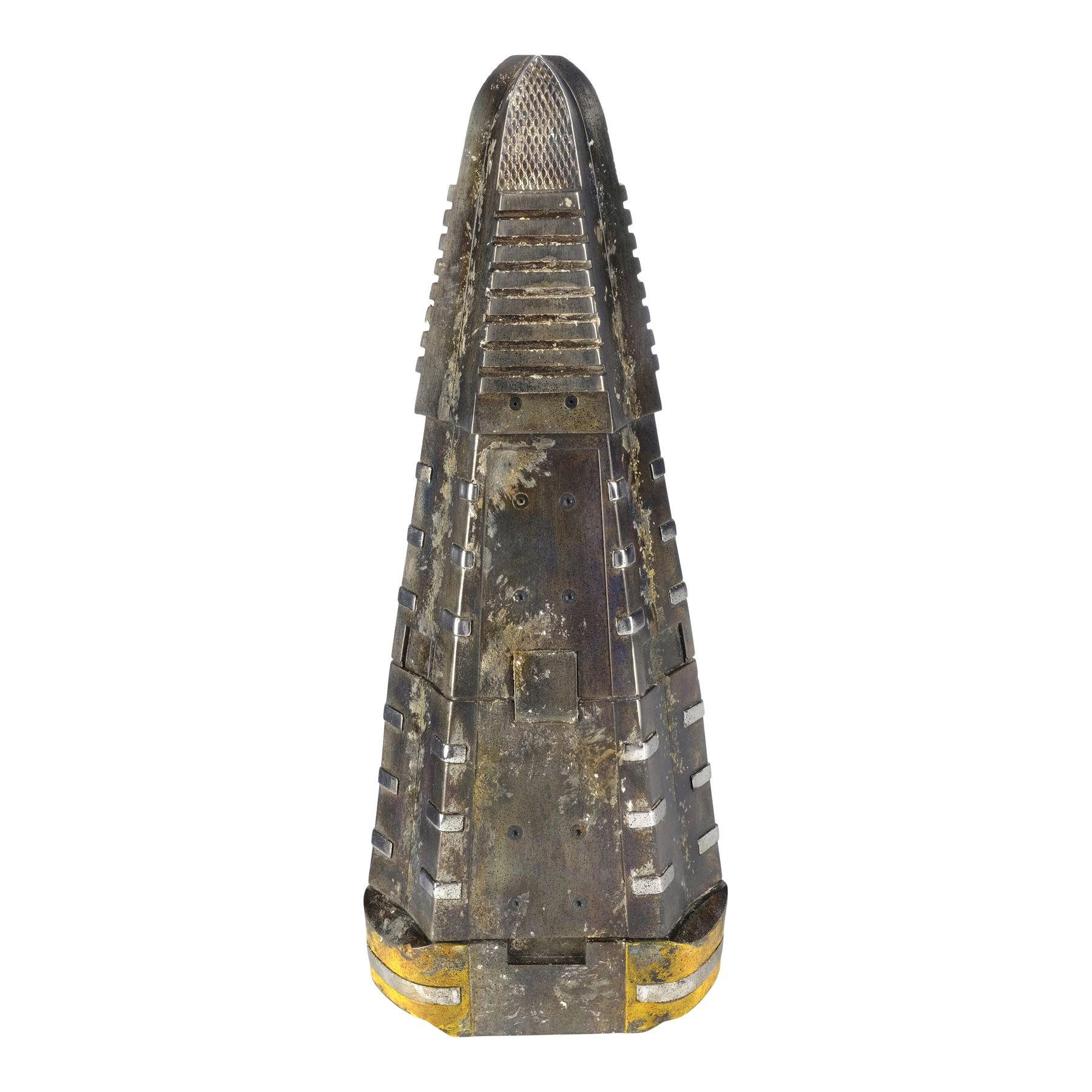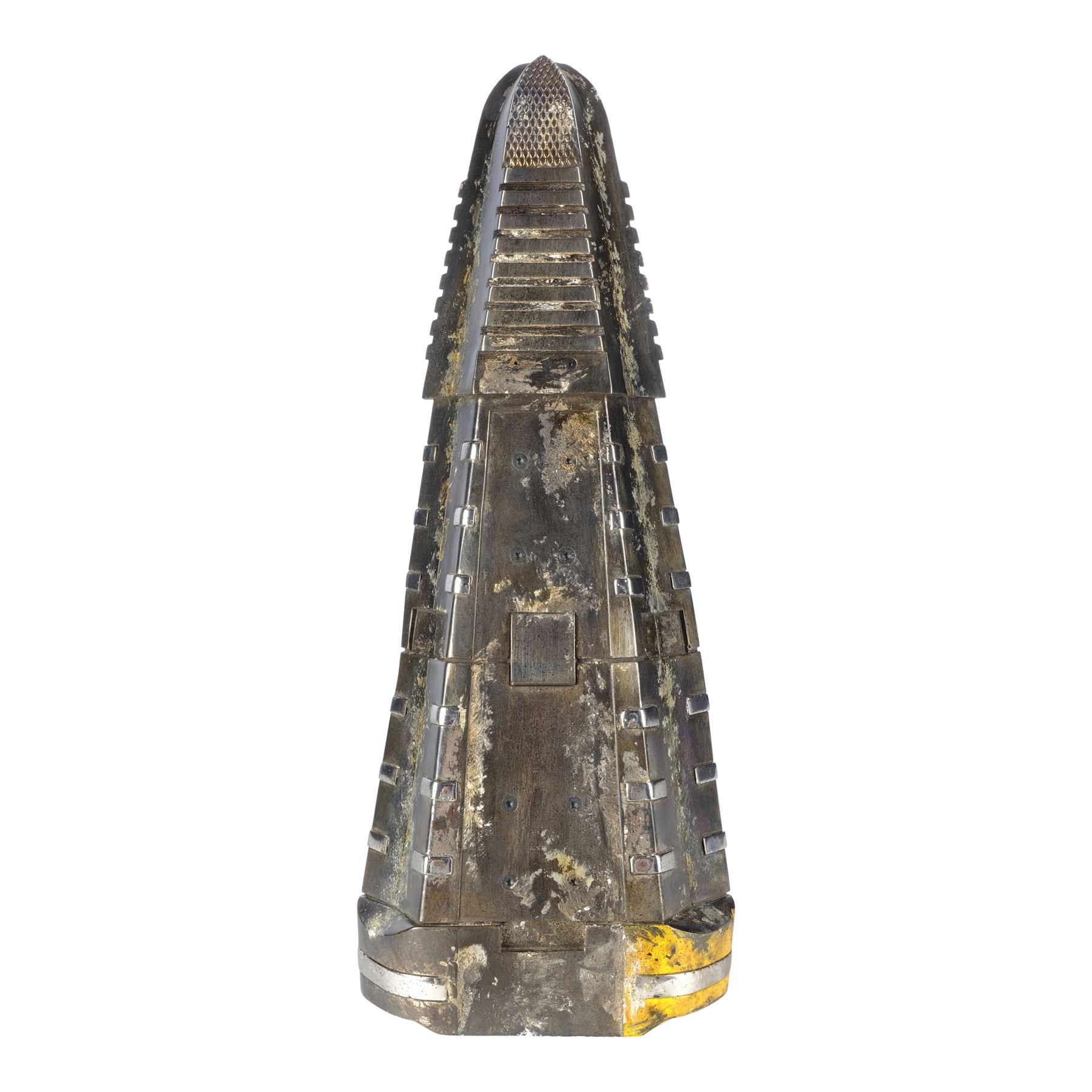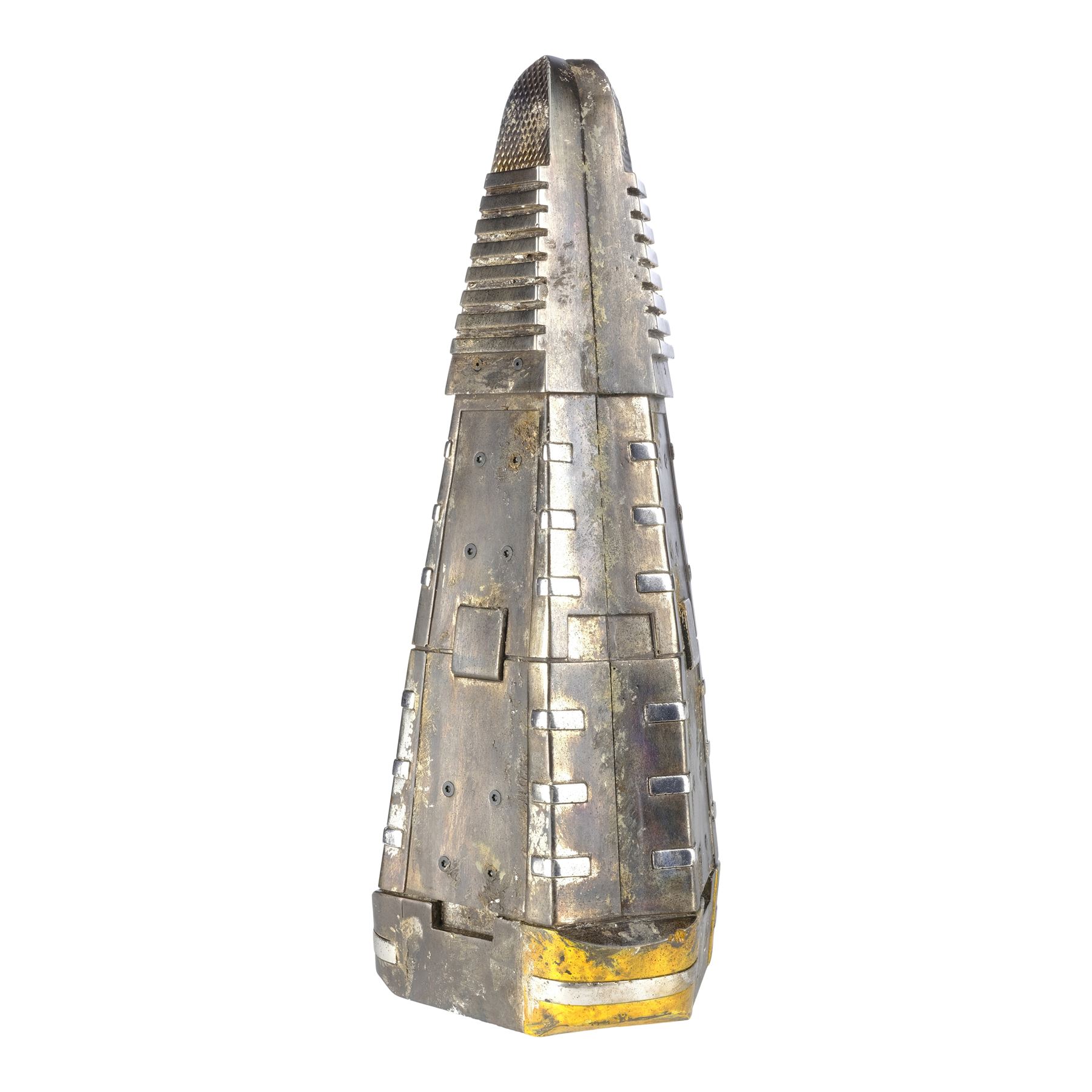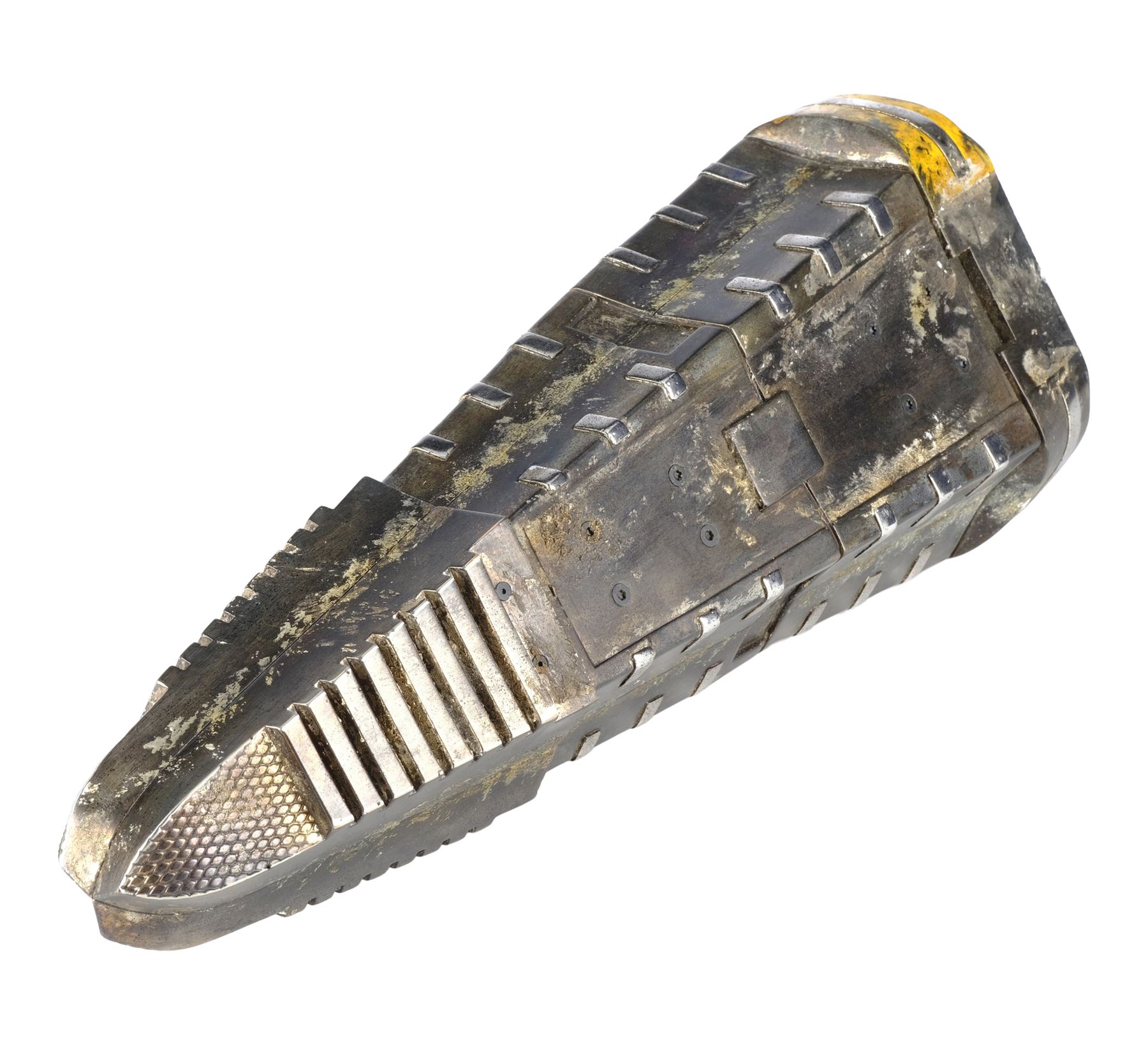 Constructed from machined and paneled metal segments screwed together, this detailed tentacle claw culminates at the center point of three closed prongs. Two prongs are painted yellow at the hexagonal base, while the underside of the claw is hand-marked "Closed Heavy Weight 1 Head" in black marker and features holes for mounting to a larger tentacle. The claw is intentionally distressed by production to appear rusted and welded together at the seams. It exhibits scratching throughout. Dimensions: 14.5" x 5" x 6" (37 cm x 12.75 cm x 15.25 cm)