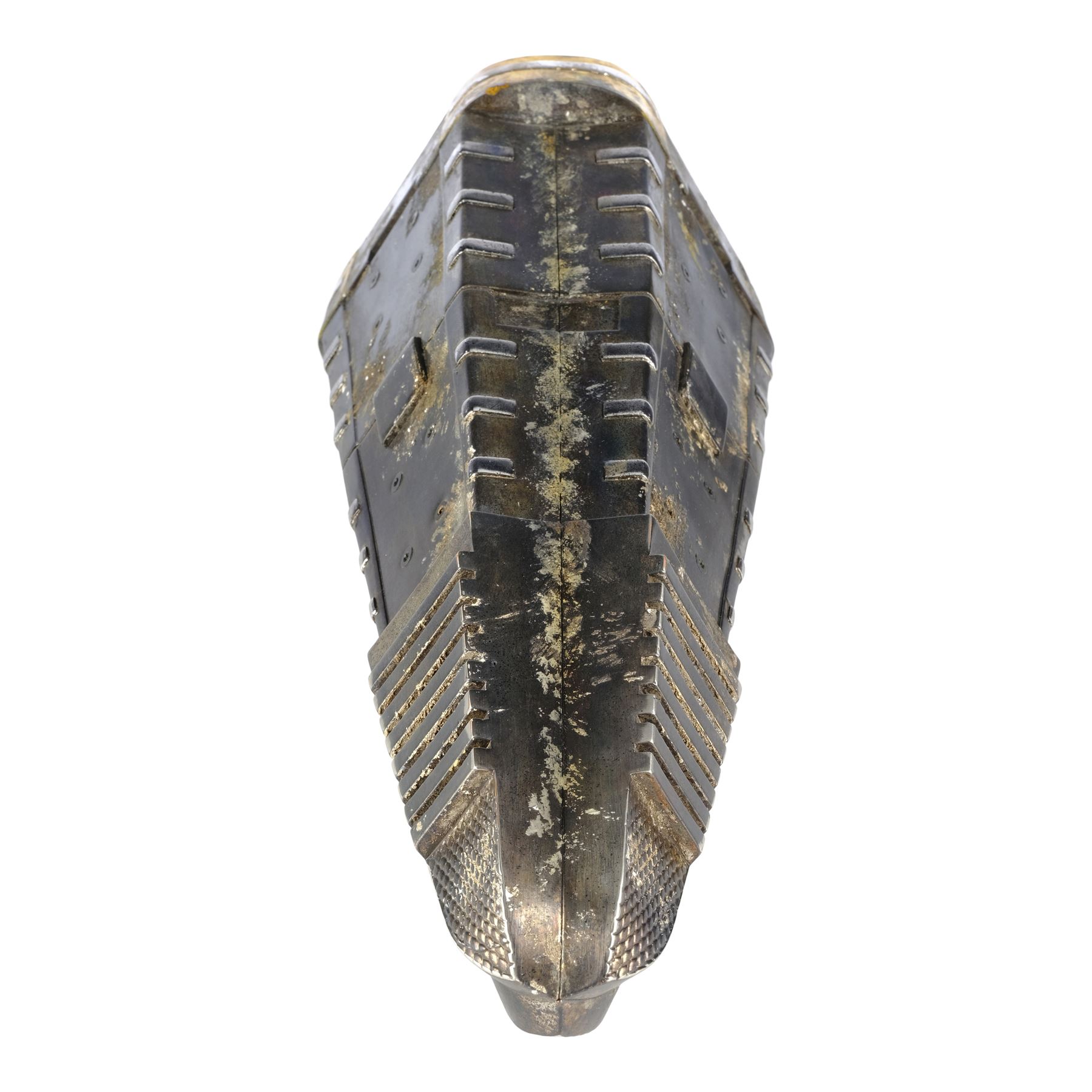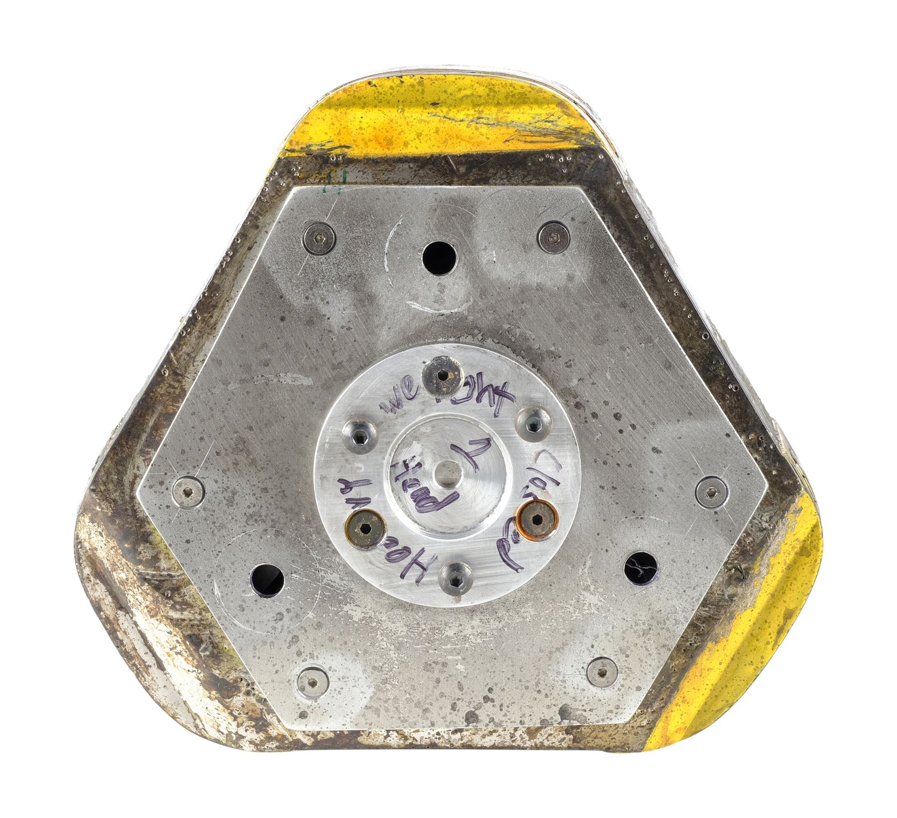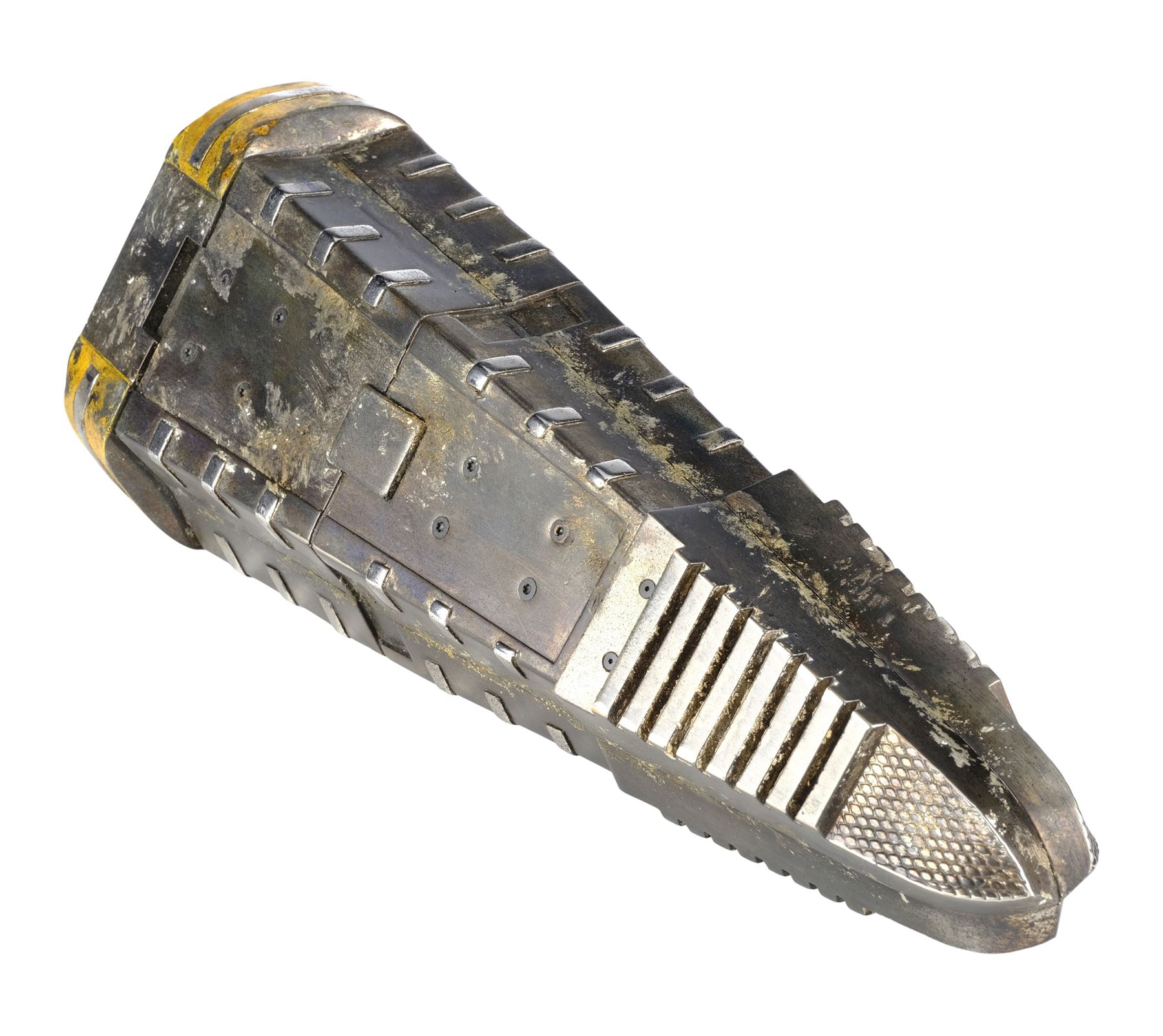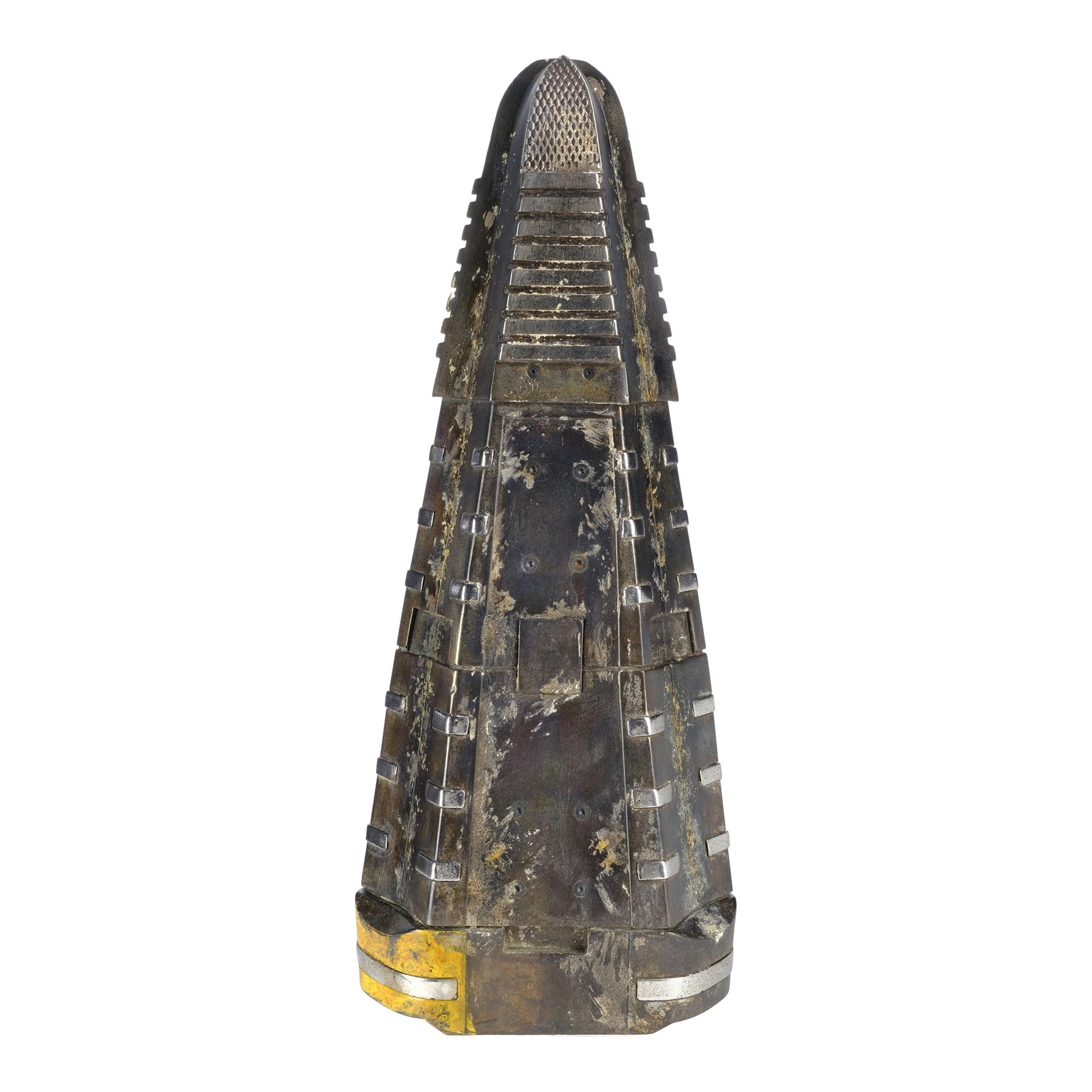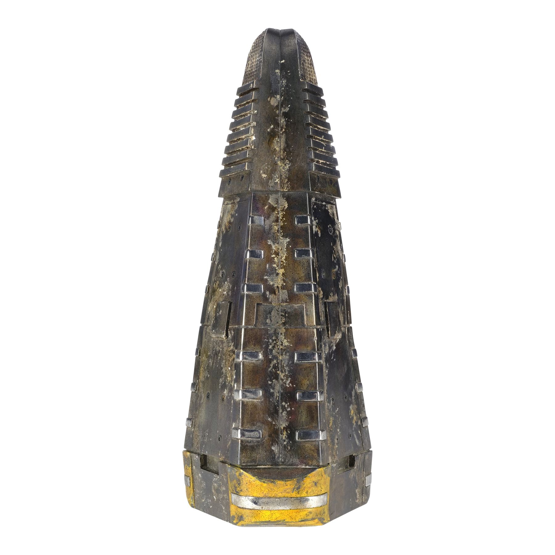 Constructed from machined and paneled metal segments screwed together, this detailed tentacle claw culminates at the center point of three closed prongs. Two prongs are painted yellow at the hexagonal base, while the underside of the claw is hand-marked "Closed Heavy Weight 1 Head" in black marker and features holes for mounting to a larger tentacle. The claw is intentionally distressed by production to appear rusted and welded together at the seams. It exhibits scratching throughout. Dimensions: 14.5" x 5" x 6" (37 cm x 12.75 cm x 15.25 cm)