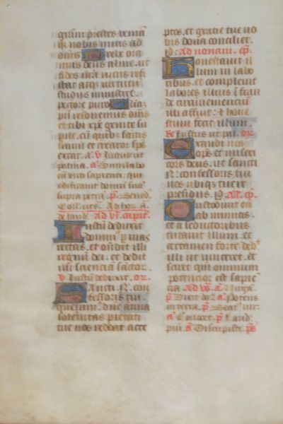 Illuminated manuscript on vellum, framed. A leaf from the Book of Hours, a devotional book popular in the Middle Ages. It was developed for lay people who wished to incorporate elements of monasticism into their devotional life. In double sided frame