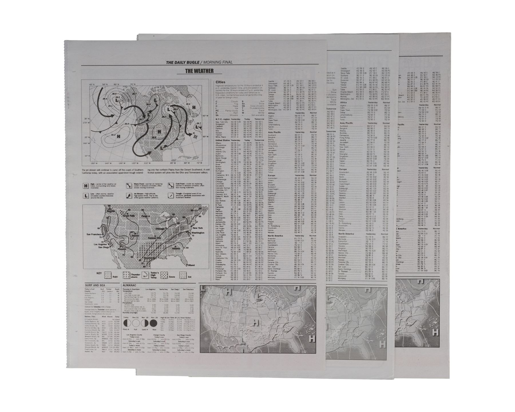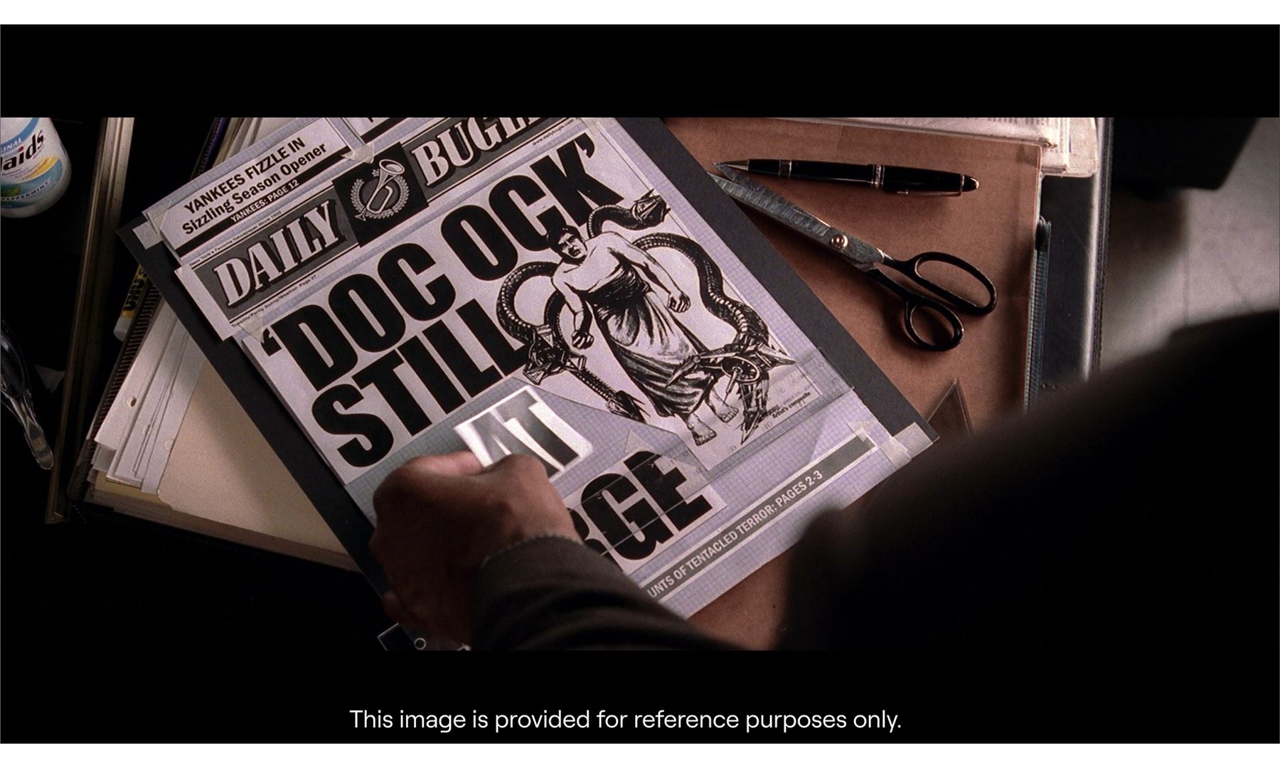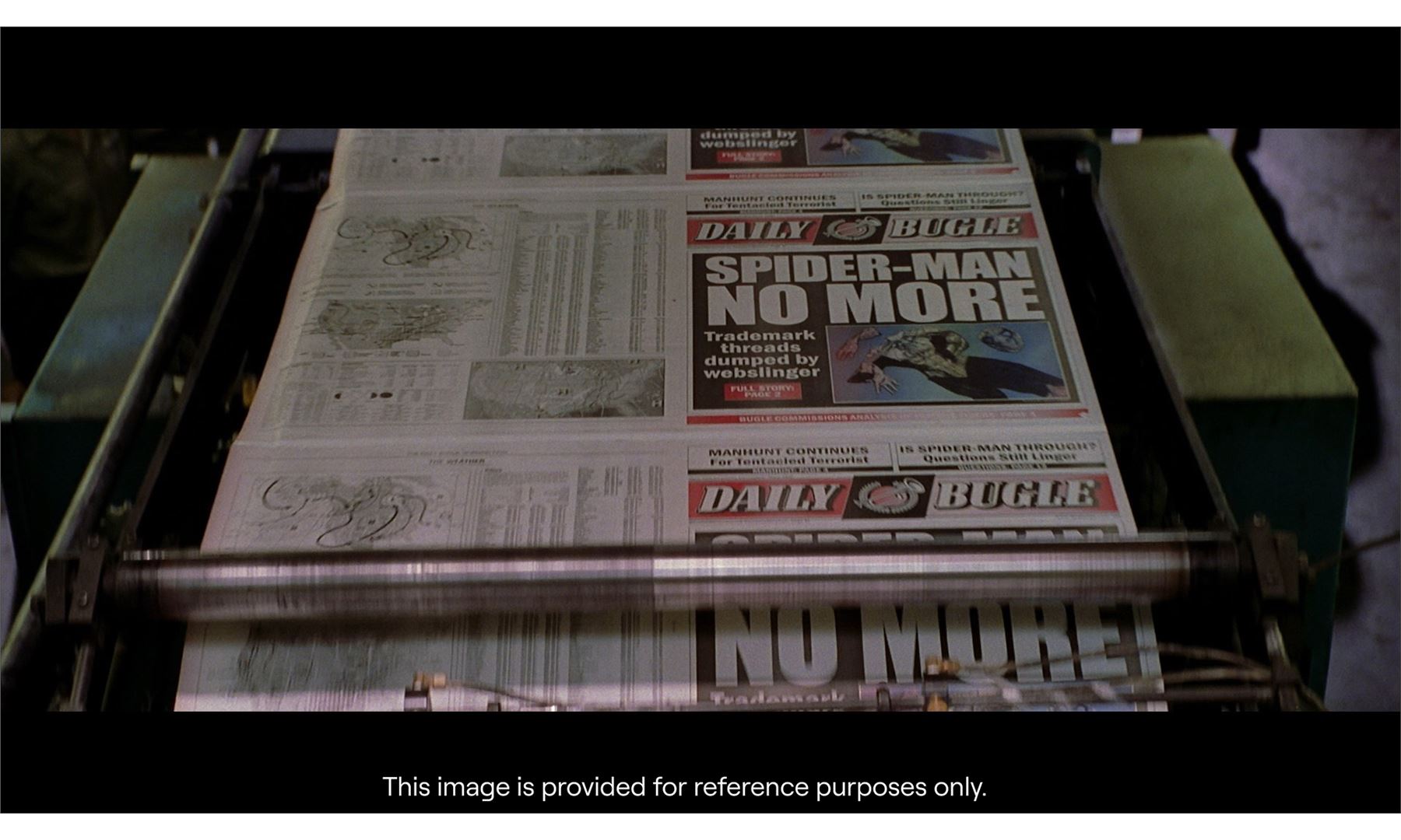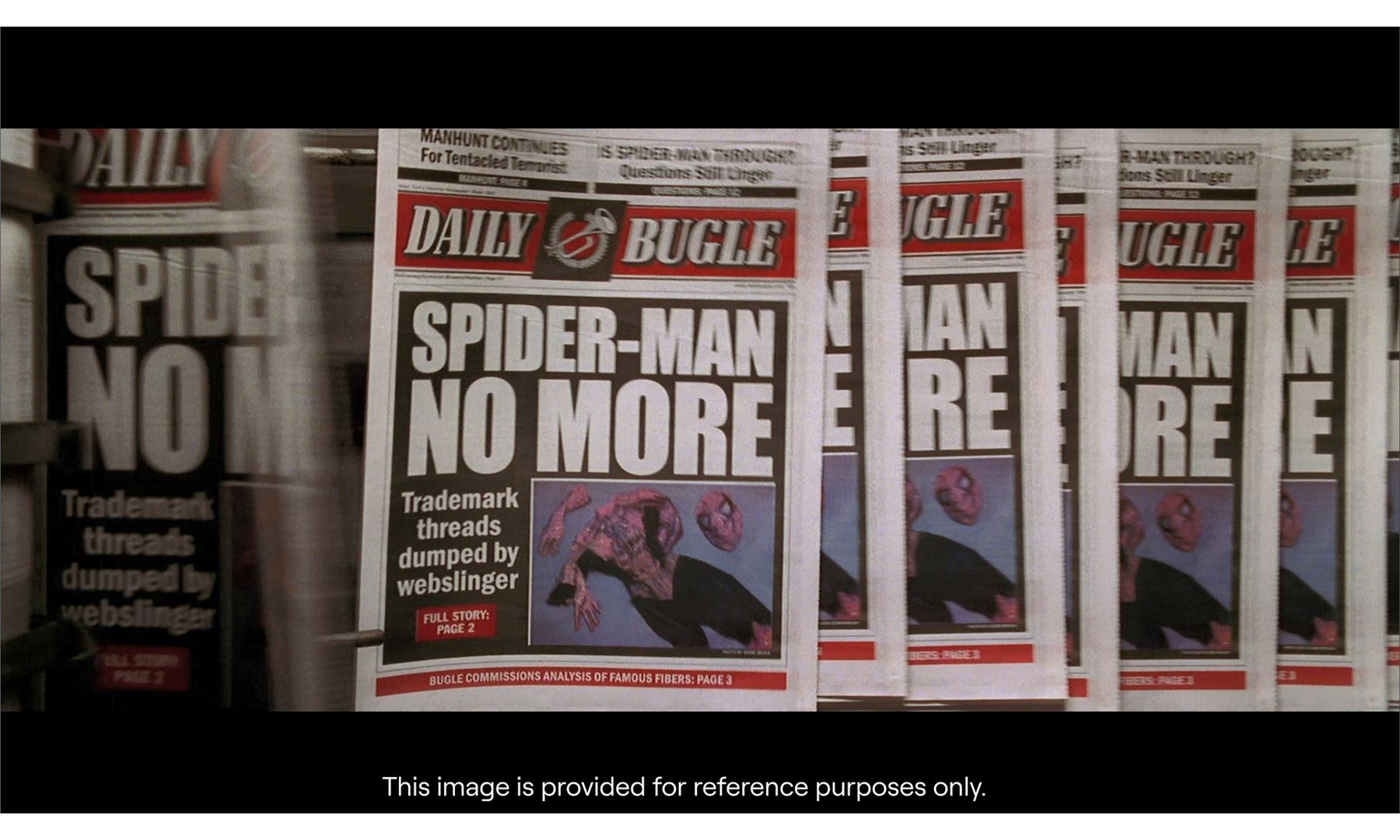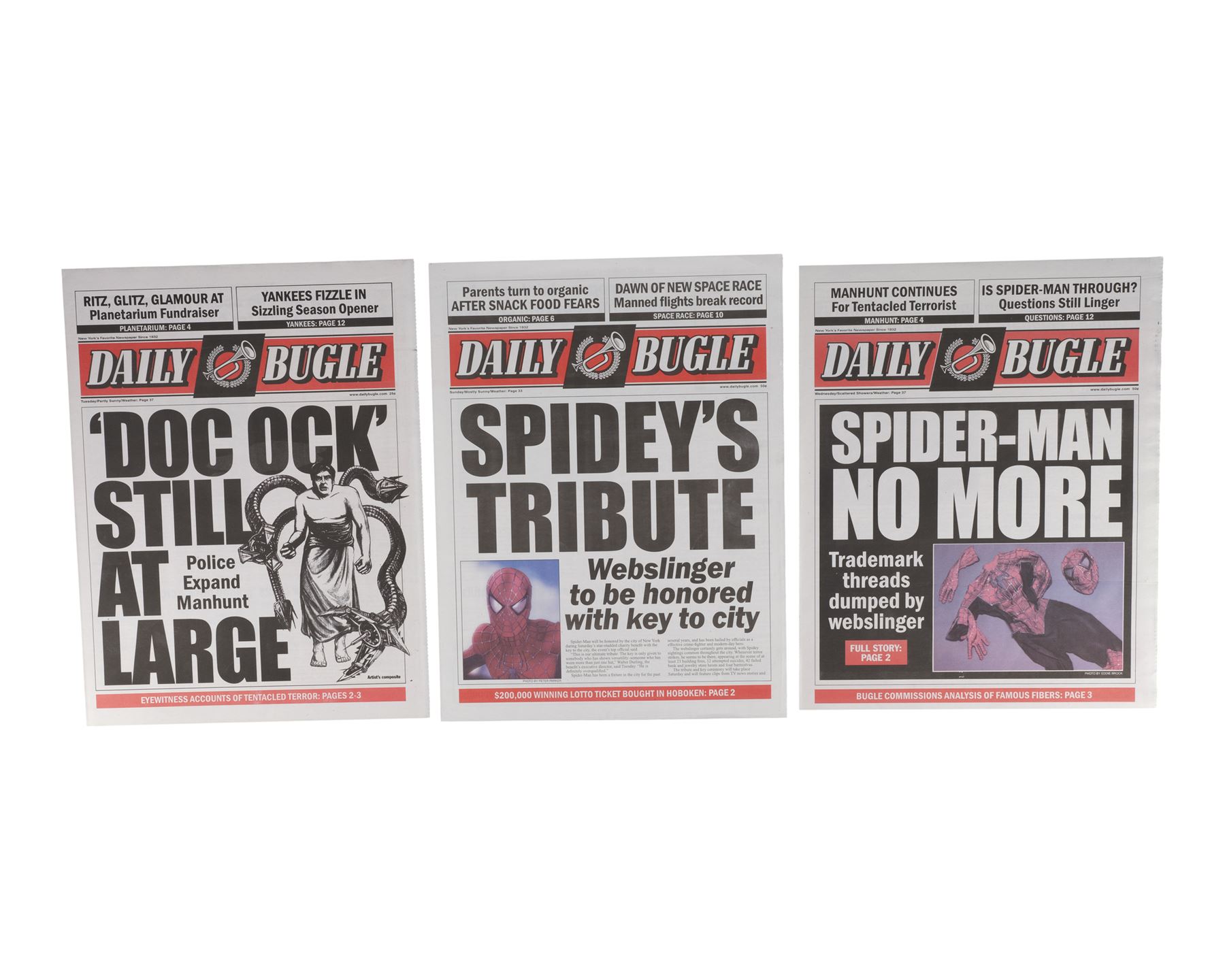 SPIDER-MAN 2 (2004) - Set of Three Daily Bugle Newspaper Covers - A set of three Daily Bugle newspaper covers from Sam Raimi's Spider-Man 2. J. Jonah Jameson's (J.K. Simmons) Daily Bugle ran story after story criticizing Spider-Man's (Tobey Maguire) crime-fighting spree, leading him to give up his Spidey-suit.