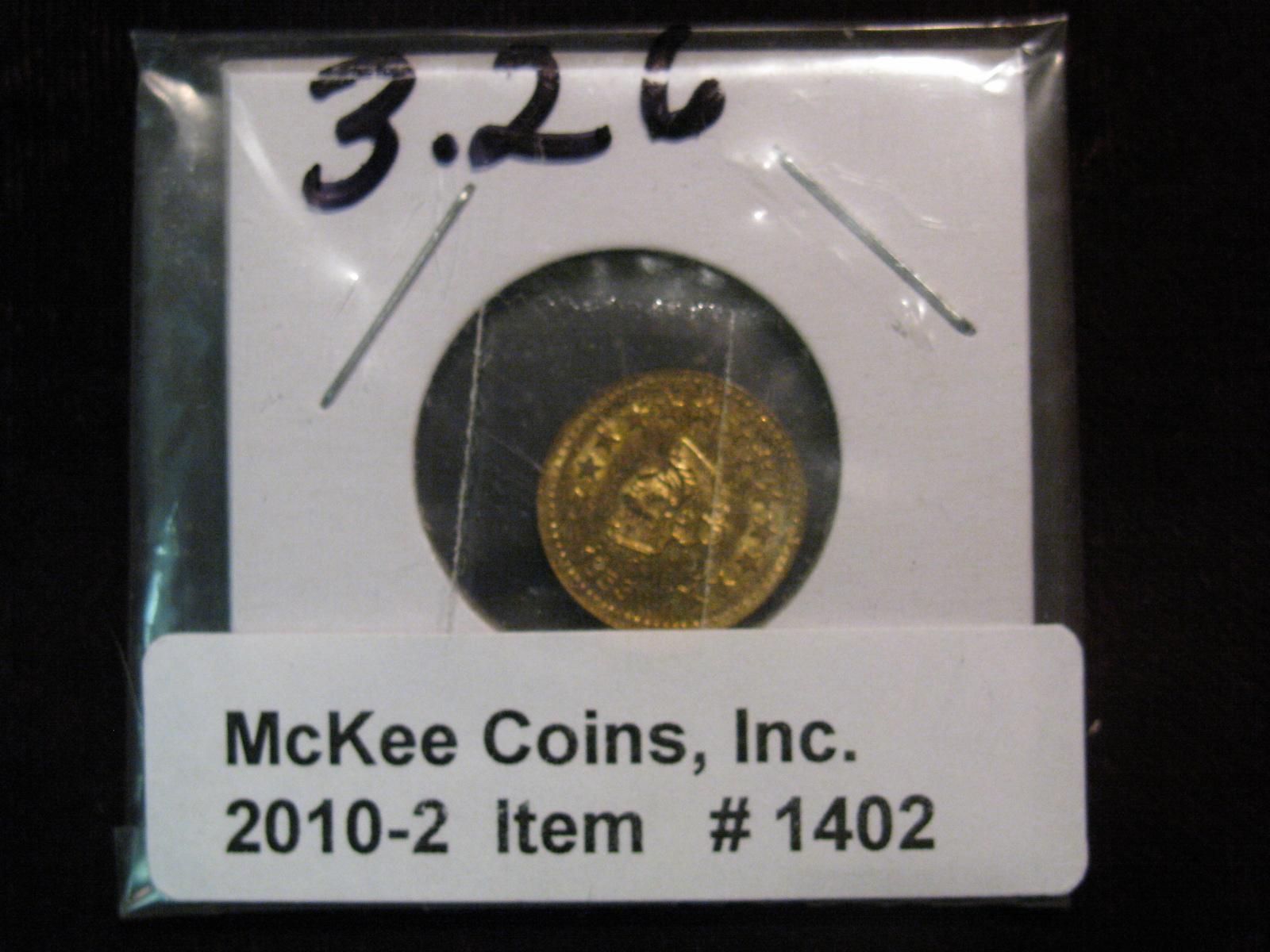 1402. 1853 California Gold Token. Round. BU. Not original California Fractional Gold.