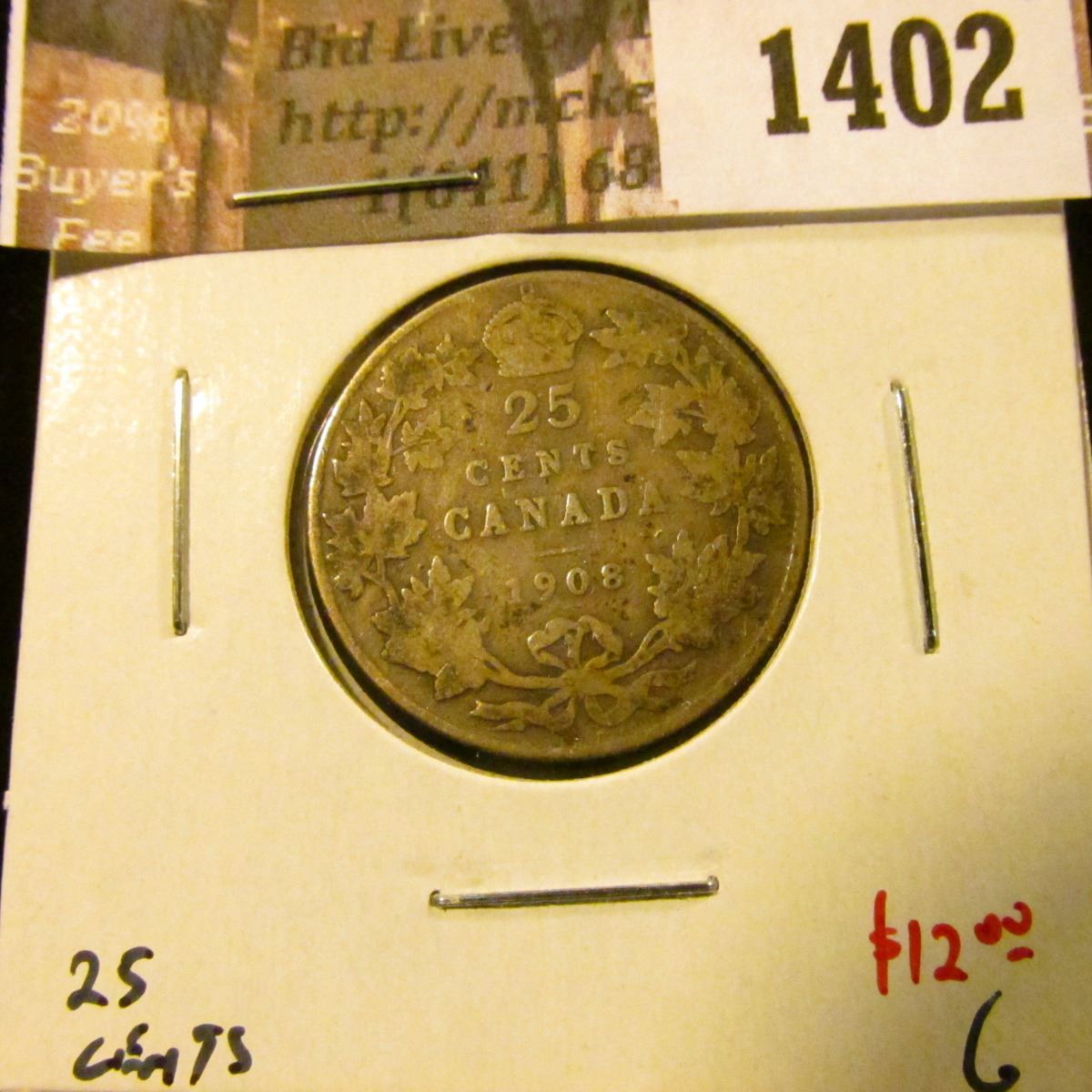 1402 . 1908 Canada 25 Cents, G, low mintage semi-key date, value $1