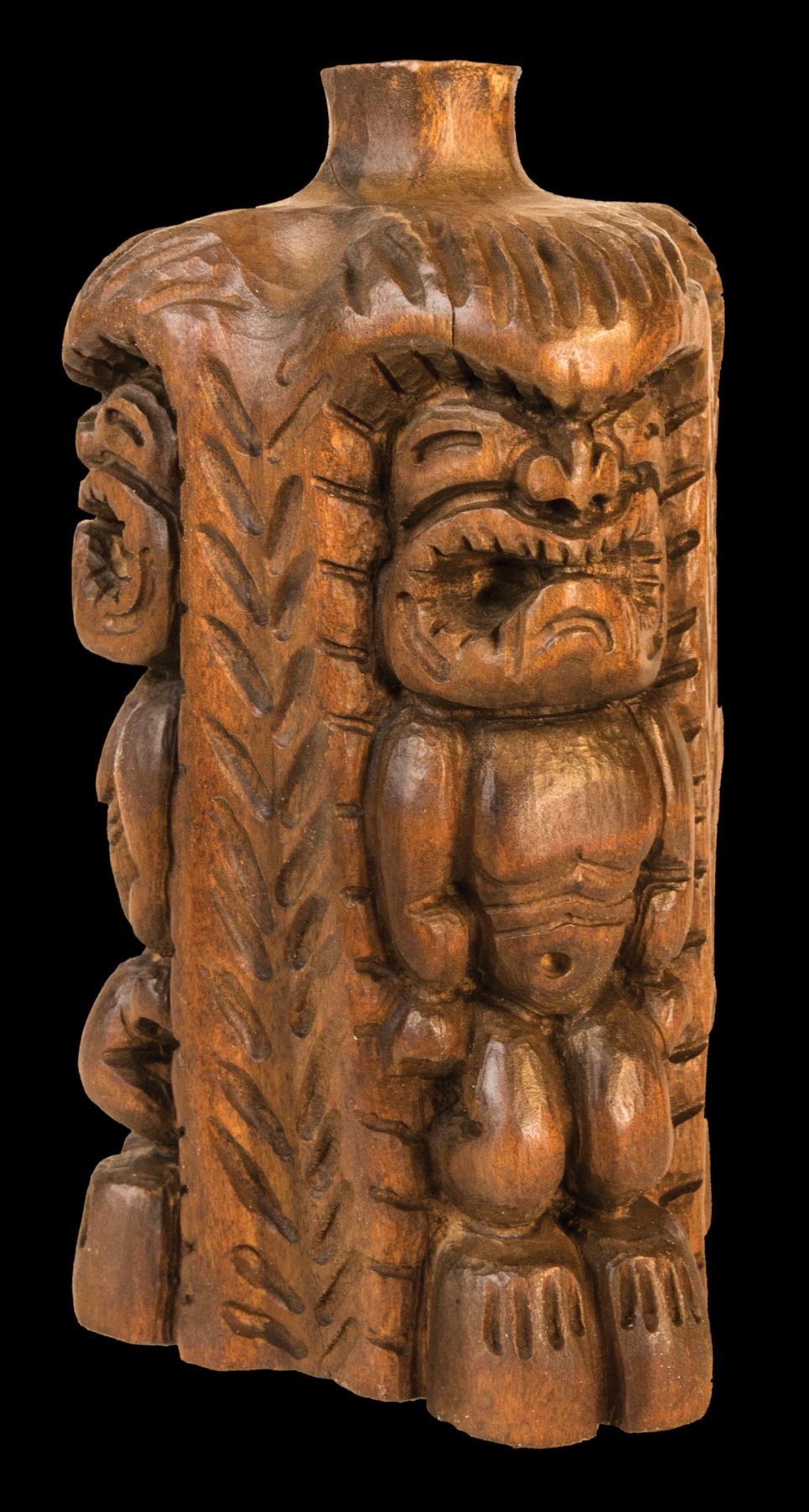(1960s) This famous carving was used mainly for Tiki table lamps, although OA also offered these as general decor. The design includes three Hawaiian Ku gods, back to back. Here is the master pattern carving with spindle chocks present. Rare! 6.25"x3". VG+ with typical wear.