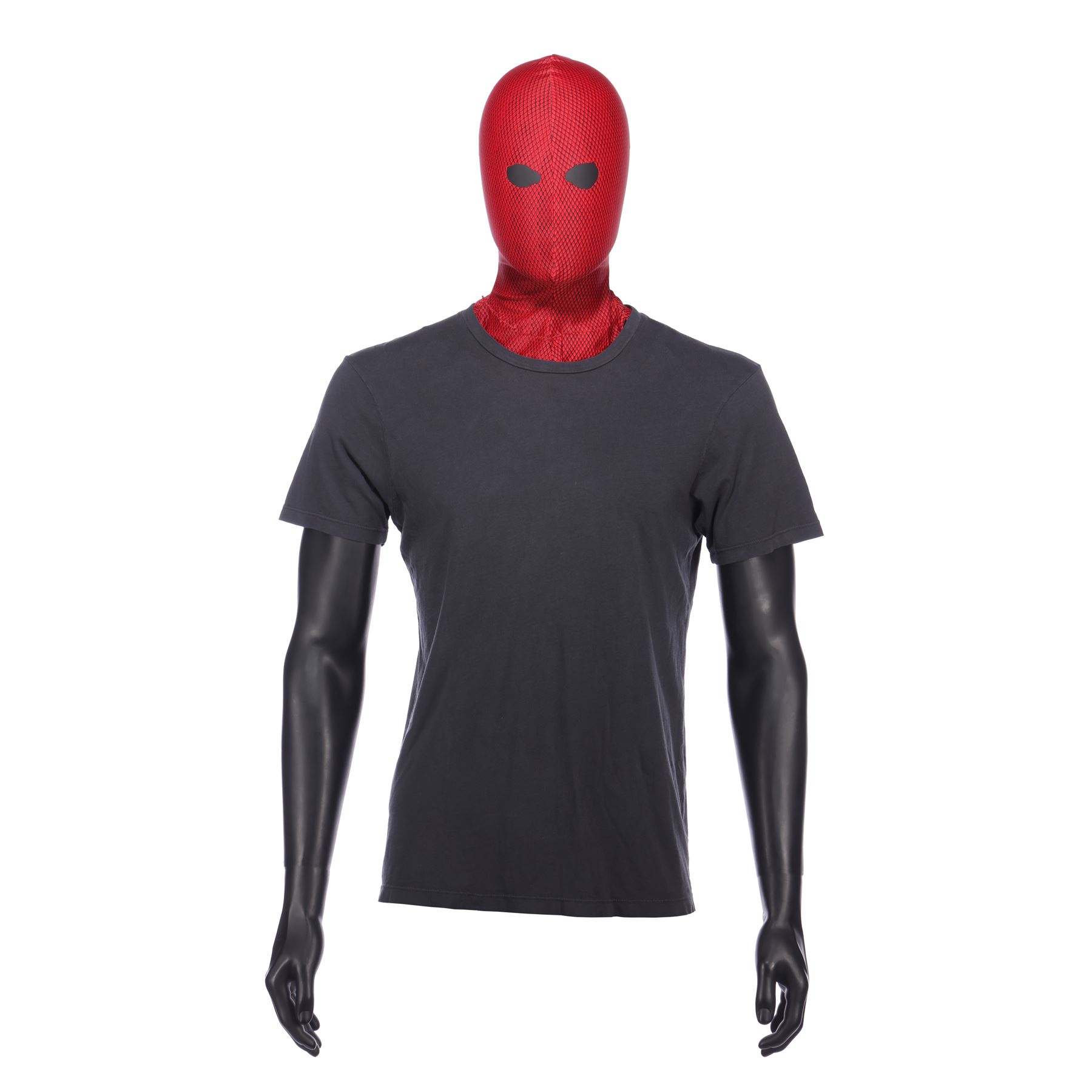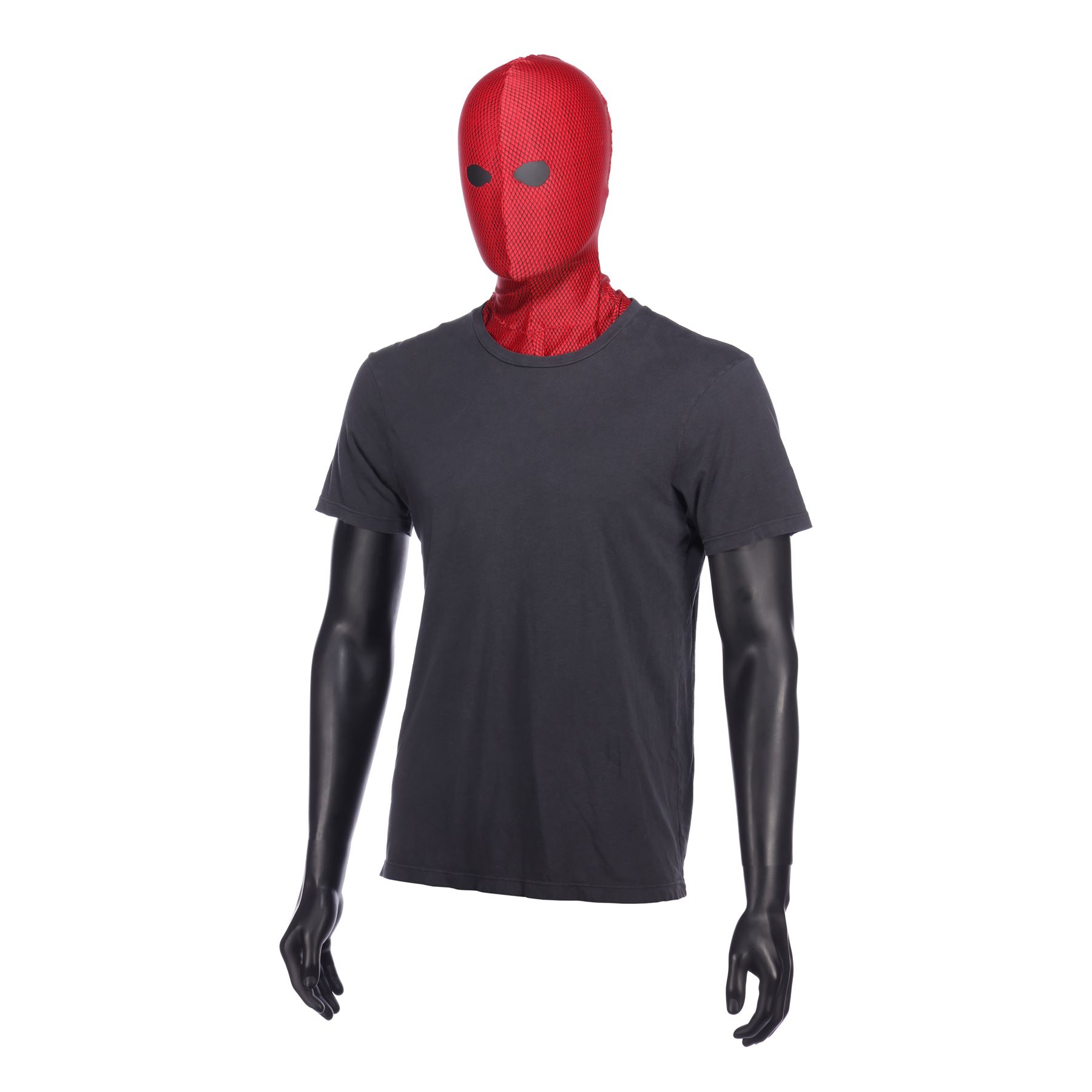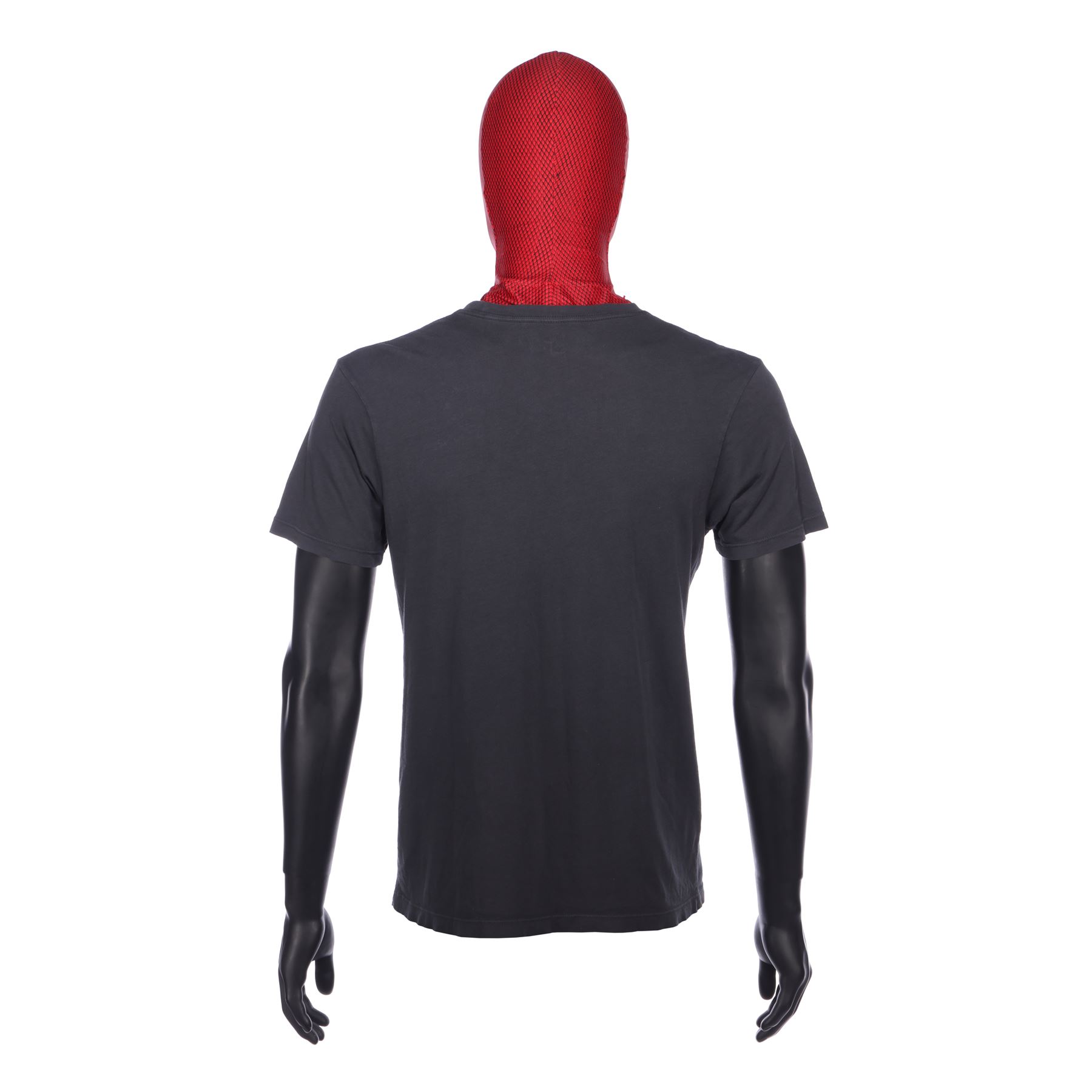 THE AMAZING SPIDER-MAN (2012) - Prototype Stunt Spider-Man Mask and T-Shirt - A prototype stunt Spider-Man mask and T-shirt from Marc Webb's superhero film The Amazing Spider-Man. Included is a mask and T-shirt, which Peter (Andrew Garfield) wore when he embarked in earnest on his mission to track down his uncle's killer. The mask is made of Spandex in the classic Spider-Man red, with two crudely cut eye holes and rough stitching around the neck. The T-shirt (Size M) is plain black and has "Peter stunt" handwritten on the collar. The mask also features small holes on either side to allow Peter to wear sunglasses.