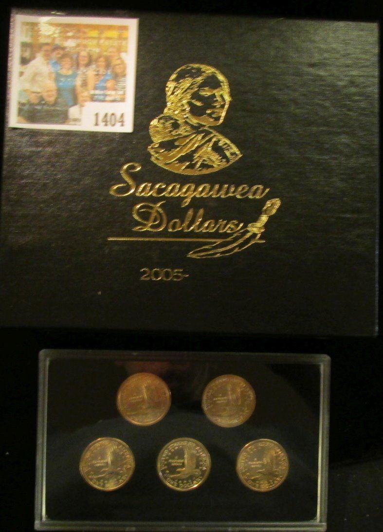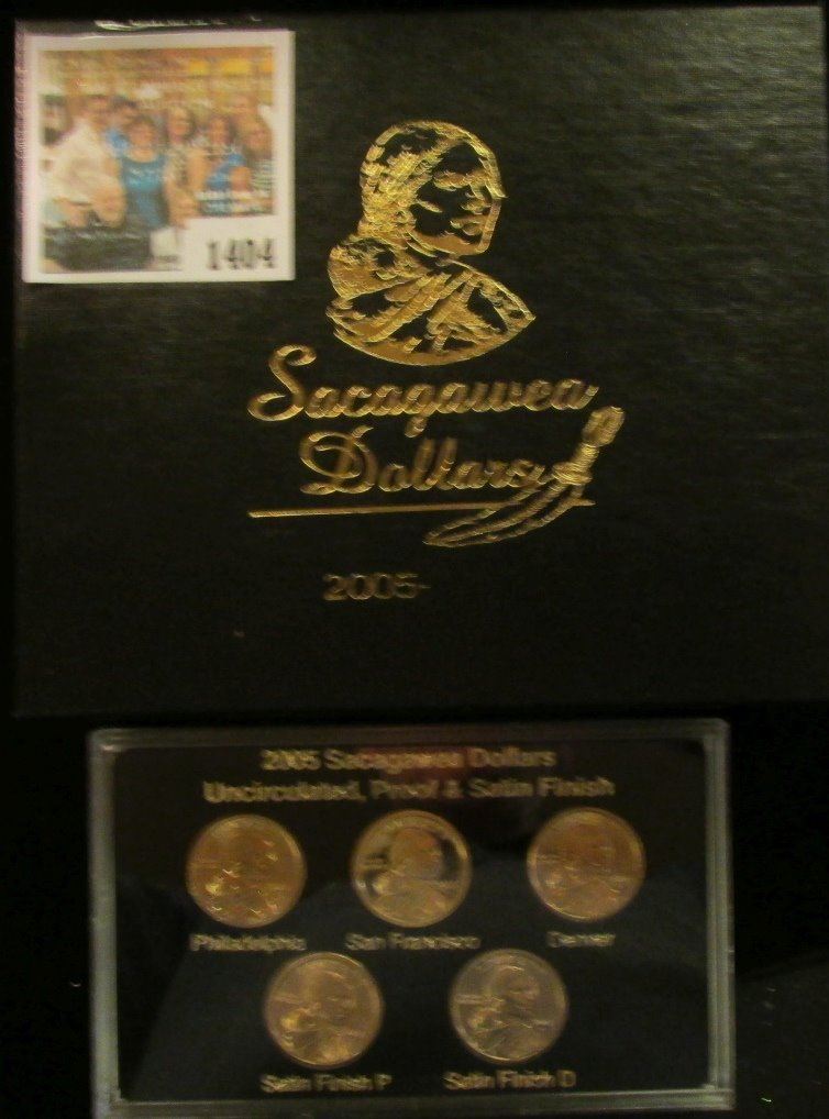 "Sacagawea Dollar 2005" Five dollars encased in a holder and stored in a box.The set containing P, D, S Proof or BU coins,and both Satin finish pieces.