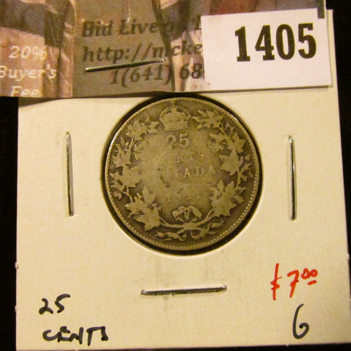 1405 . 1911 “Godless” Canada 25 Cents, G, one year type, value $7