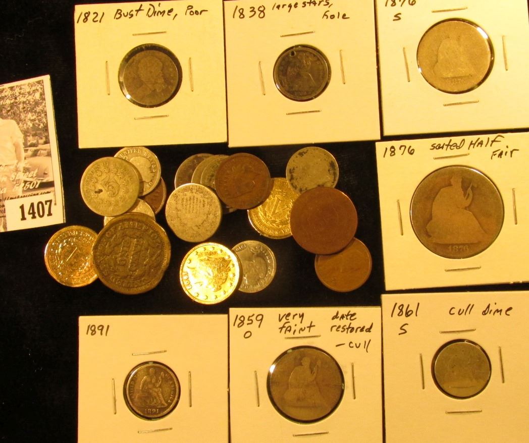 1407 . $2.18 face value of very worn or cull U.S. Coins, 1821-1921. Includes 2c, 3c Nickel, Seated L