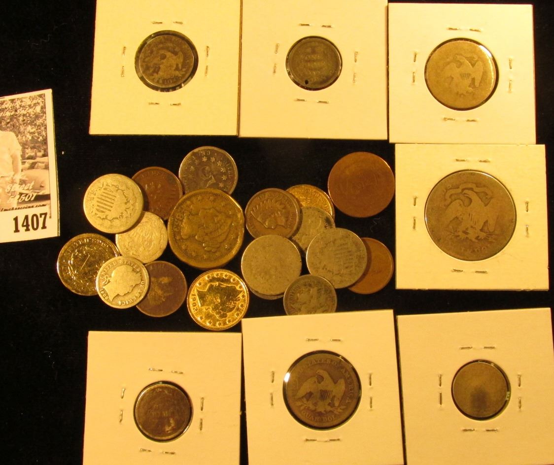 1407 . $2.18 face value of very worn or cull U.S. Coins, 1821-1921. Includes 2c, 3c Nickel, Seated Liberty Half Dollar, couple of gold-plated Liberty Nickels including an 1883 NC “Racketeer” Nickel, & etc.