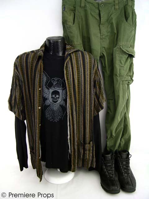 Mike's (John Cusack) black "American Apparel" L/S thermal shirt (size XL). Black "Vans" eagle and skull S/S t-shirt (size XL). Black/dark blue/brown/green/grey striped S/S button up shirt. Green "Mountain Beach Ocean Land Fat Face" cargo pants (size 38). Black leather "Timberland" shoes (size 12). (screen worn)