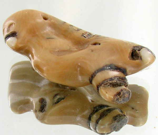 Excellent natural specimen; drilled and ready for pendant; with customary treatment but natural color