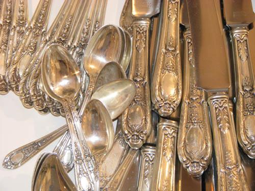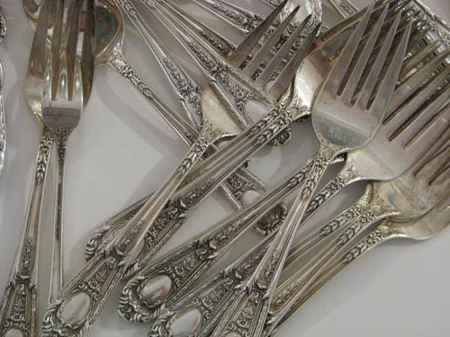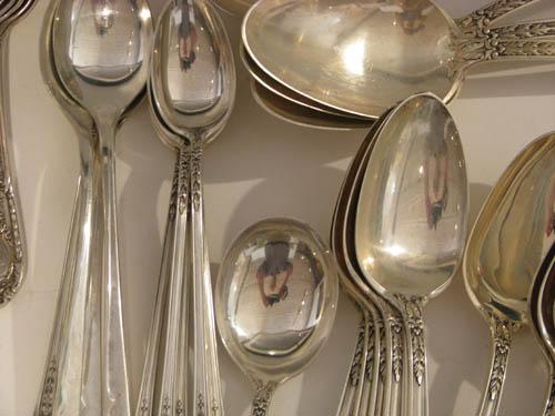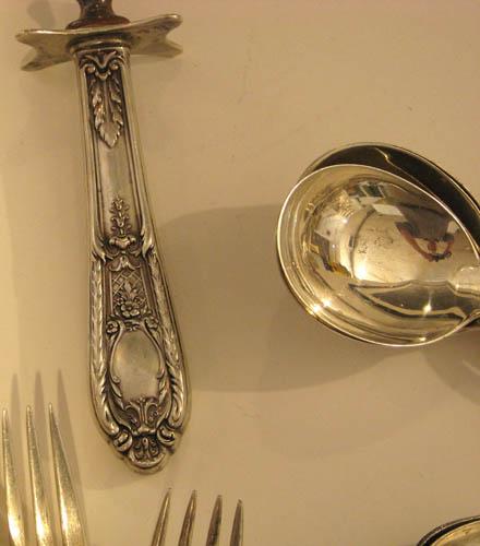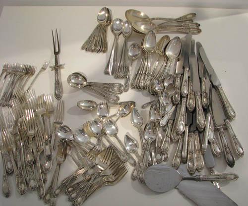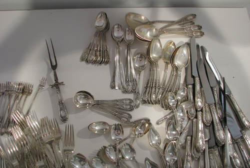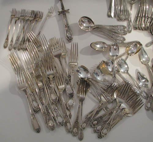 Title: Sterling Flatware Set Fontaine Pattern 1924 including: 12 dinner forks, 6 salad forks, 12 desert forks, 12 shrimp forks, 12 ice cream spoons, 12 spoons, 12 tablespoons, 11 sugar spoons, 5 iced tea spoons, 12 teaspoons, 18 knives (weighted with stainless blades (weight not included in total), 6 butter knives, 6 soup spoons, 1 long spoon, 4 serving spoons; silverplate/stainless: serving fork, knife, spatula, scraper, 3 long spoons