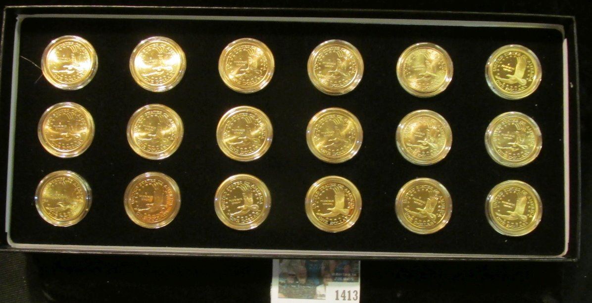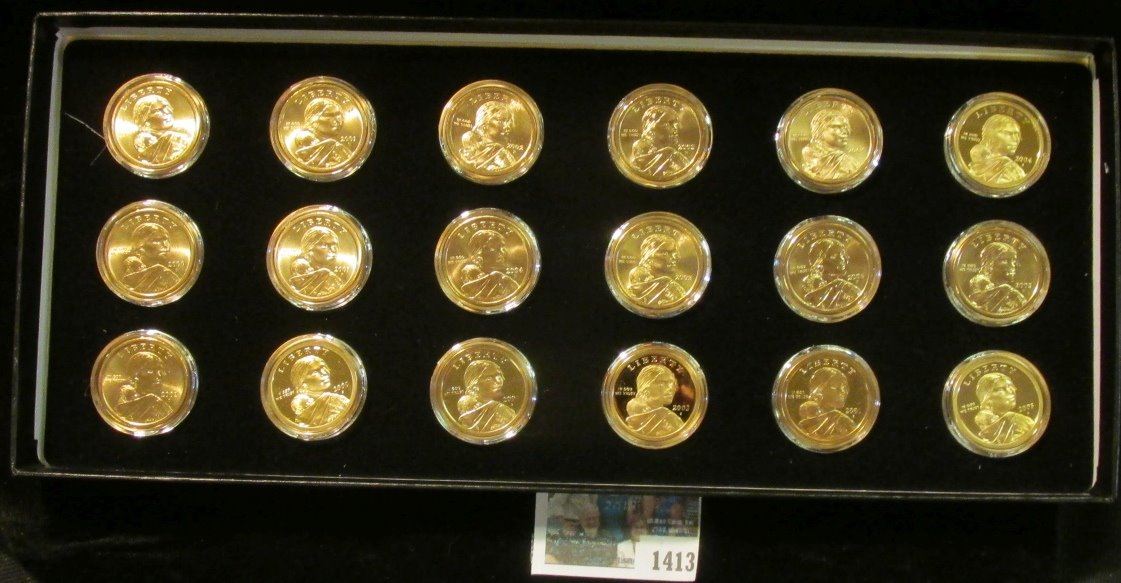 2000 P, D, S, 2001 P, D, S, 2002 P, D, S, 2003 P, D, S, 2004 P, D, S, & 2005 P, D, & S Sacagawea Proof & Uncirculated Dollar set in a special case. All coins are encapsulated. (18 pcs.).