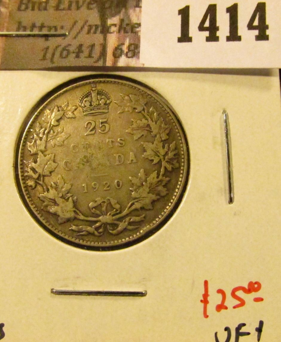 1414 . 1920 Canada 25 Cents, VF+, value $25