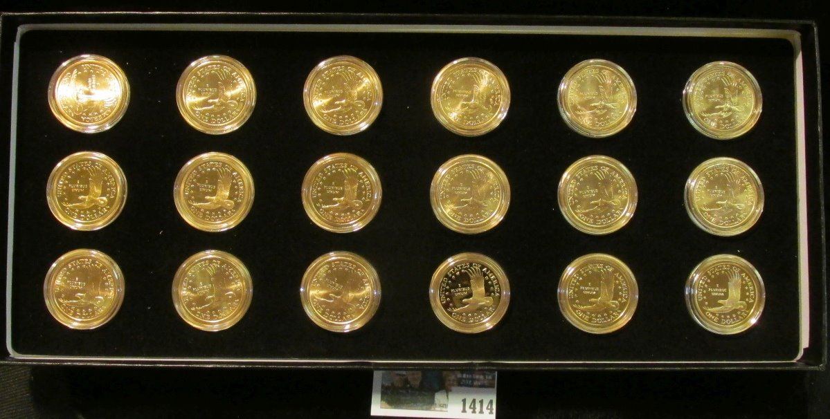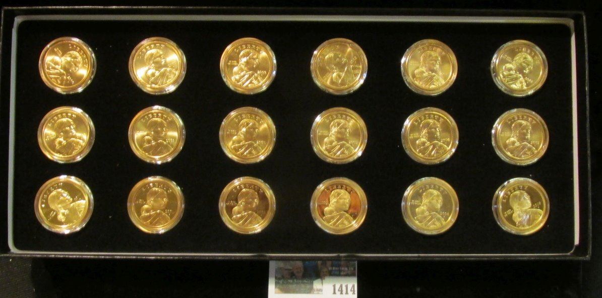 2000 P, D, S, 2001 P, D, S, 2002 P, D, S, 2003 P, D, S, 2004 P, D, S, & 2005 P, D, & S Sacagawea Proof & Uncirculated Dollar set in a special case. All coins are encapsulated. (18 pcs.).