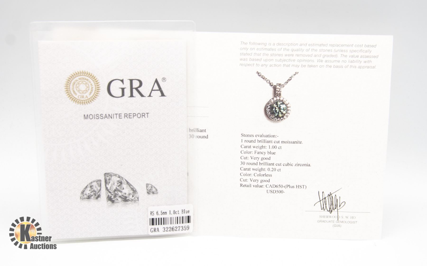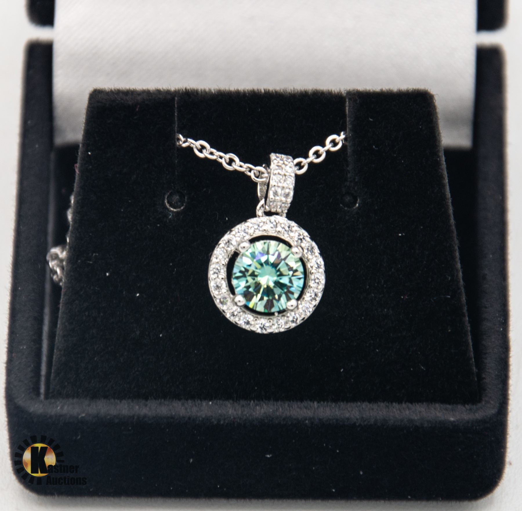 CUT MOISSANITE STONE VVS FANCY BLUE COLOR SURROUNDED BY ROUND HALO SET IN 925 SILVER PENDANT RETAIL VALUE $650.00 **ALL ITEMS MUST BE REMOVED BY 5PM SATURDAY, DECEMBER 21ST 2024. ALL REMAINING ITEMS WILL BE SUBJECT TO A $6.00 PER DAY STORAGE CHARGE. ANY ITEMS REMAINING AFTER MONDAY, JANUARY 6TH 2025 WILL BE CONSIDERED FORFEITED. NO REFUNDS WILL BE ISSUED FOR FORFEITED ITEMS. TO SCHEDULE A PICK UP APPOINTMENT CLICK HERE