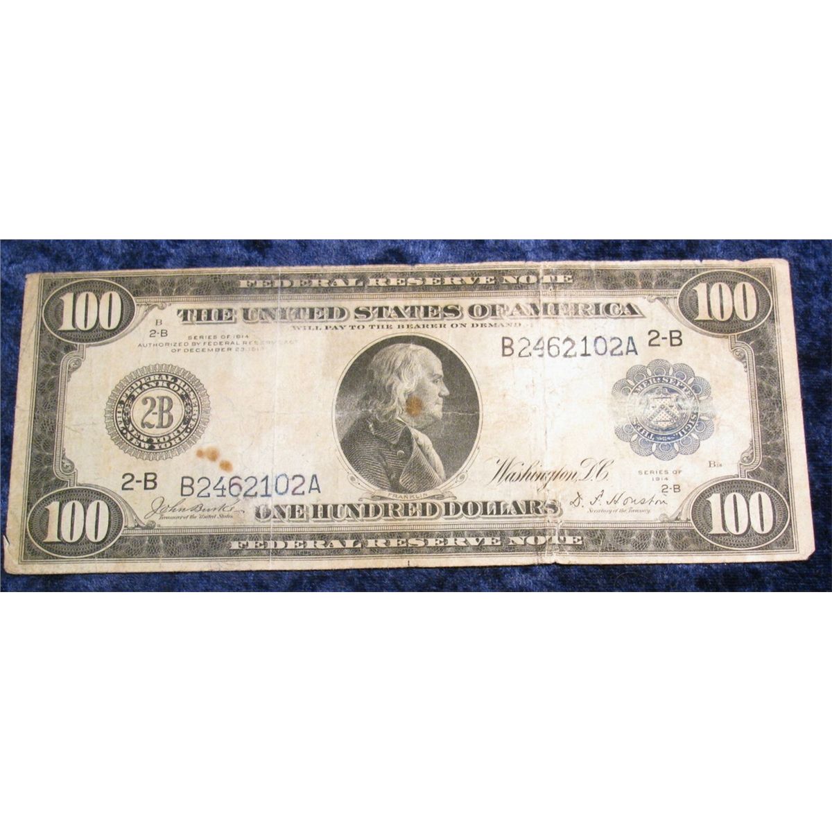 1415. Series 1914 $100 Federal Reserve Note. New York, N.Y. Signed Burke and Houston. VG.