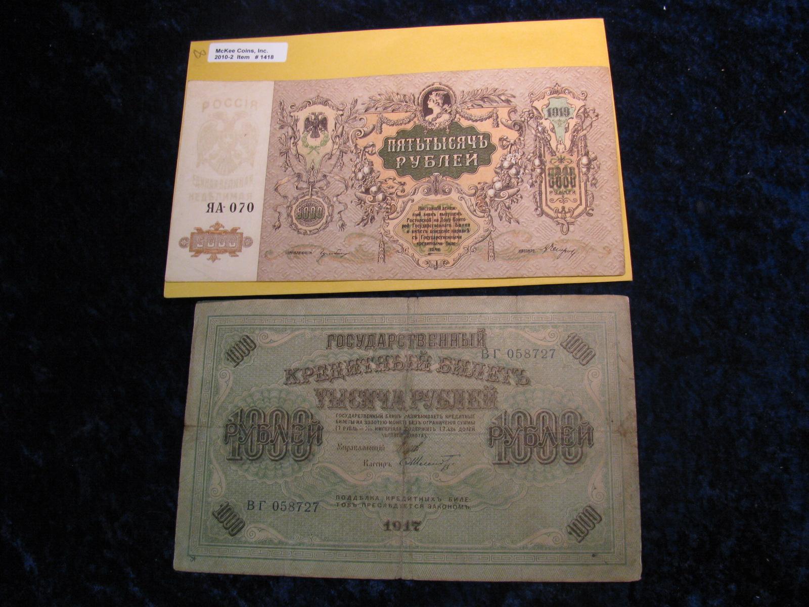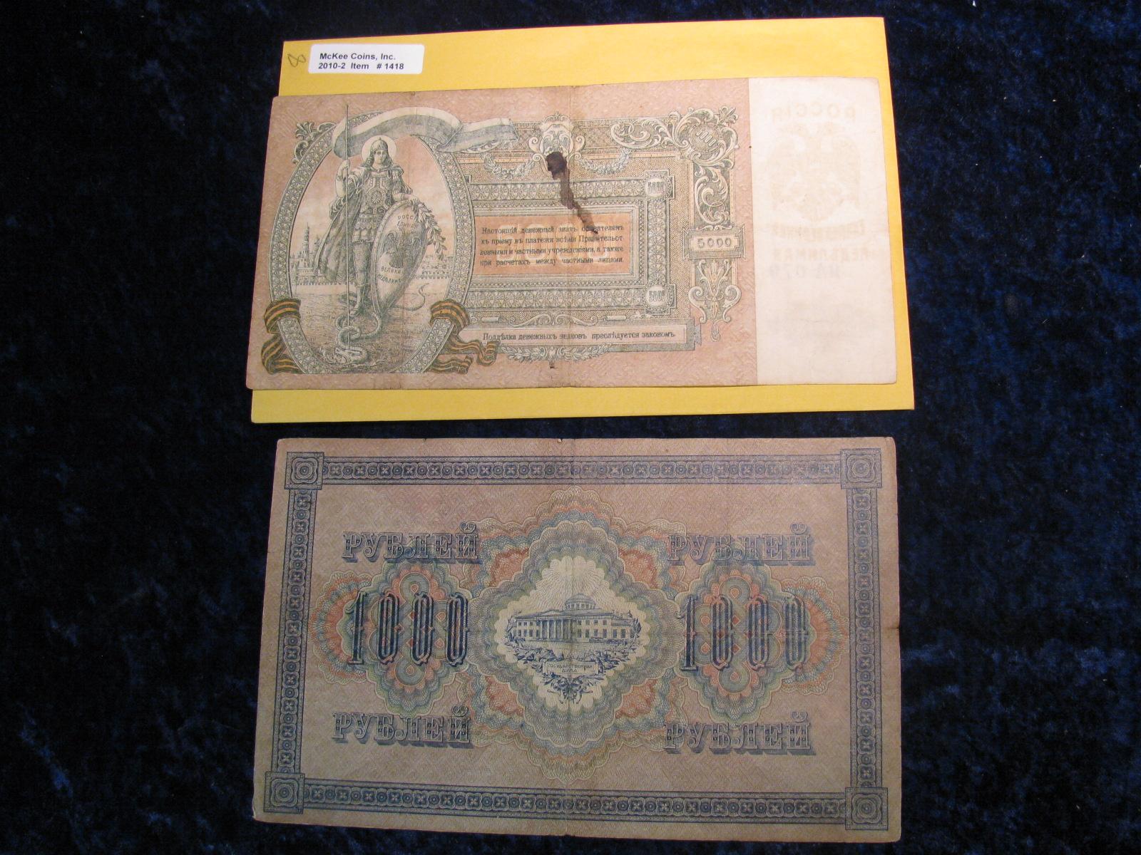 1418. 1917 1,000 Rouble & 1919 5,000 Rouble Czarist Russia Colorful Banknotes.