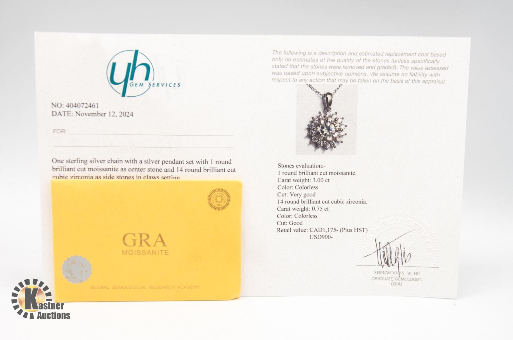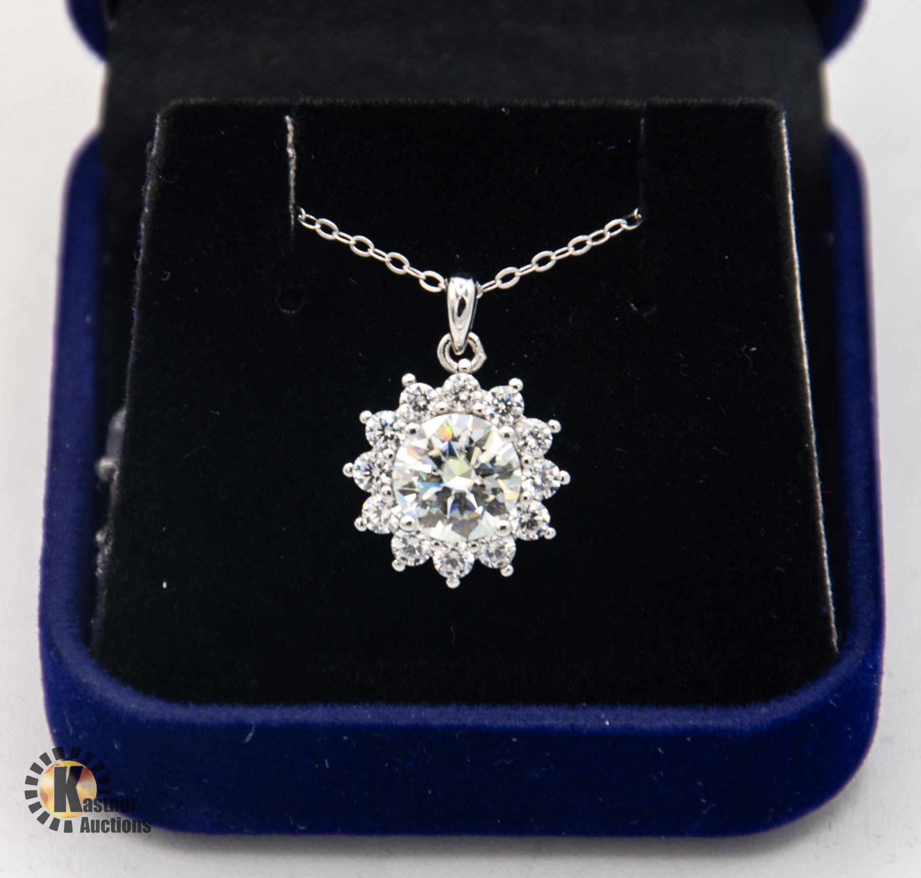 CUT MOISSANITE STONE VVS D COLOR WITH 30 ROUND CUT CUBIC ZIRCONIA SET IN ROUND HALO WITH MORE IN BALE SET IN 925 SILVER PENDANT RETAIL VALUE $1,500.00 **ALL ITEMS MUST BE REMOVED BY 5PM SATURDAY, DECEMBER 21ST 2024. ALL REMAINING ITEMS WILL BE SUBJECT TO A $6.00 PER DAY STORAGE CHARGE. ANY ITEMS REMAINING AFTER MONDAY, JANUARY 6TH 2025 WILL BE CONSIDERED FORFEITED. NO REFUNDS WILL BE ISSUED FOR FORFEITED ITEMS. TO SCHEDULE A PICK UP APPOINTMENT CLICK HERE