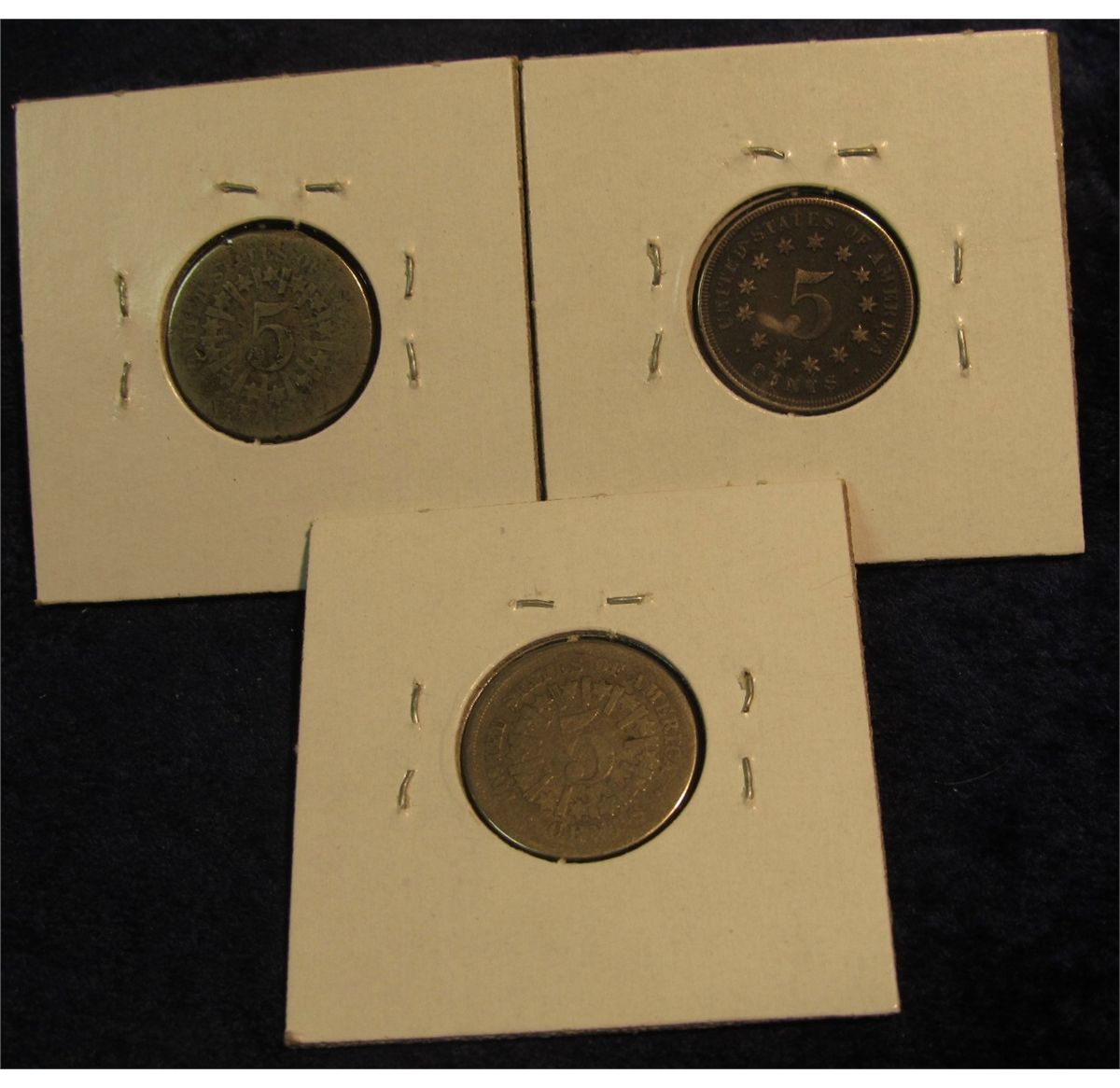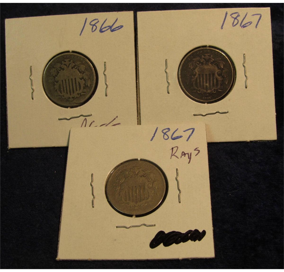 142. 1866 AG, 1867 No Rays F-12, & 1867 Rays G-4 U.S. Shield Nickels. Redbook value $88.00.