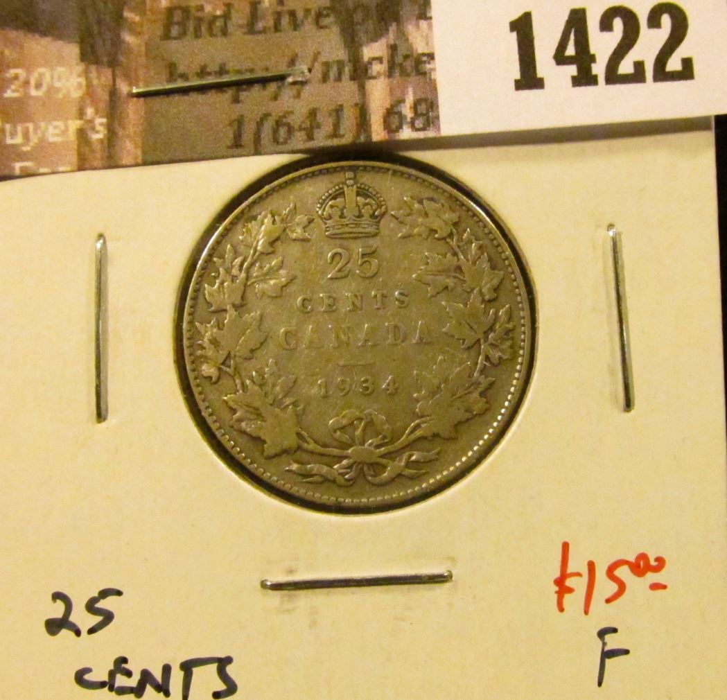 1422 . 1934 Canada 25 Cents, F, value $15