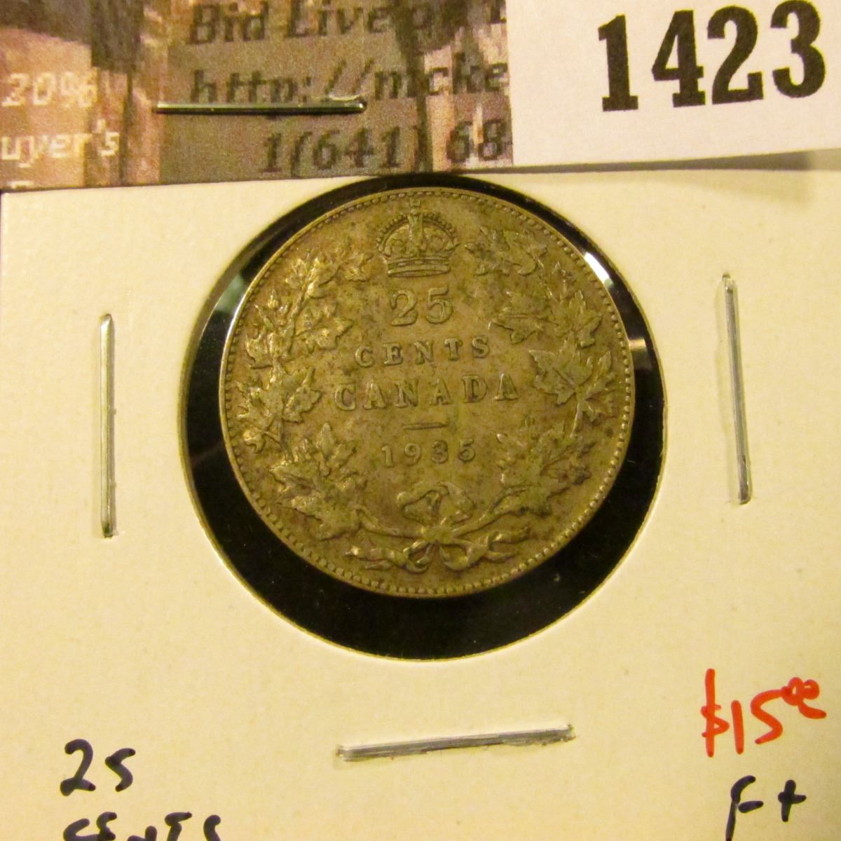 1423 . 1935 Canada 25 Cents, F+, value $15