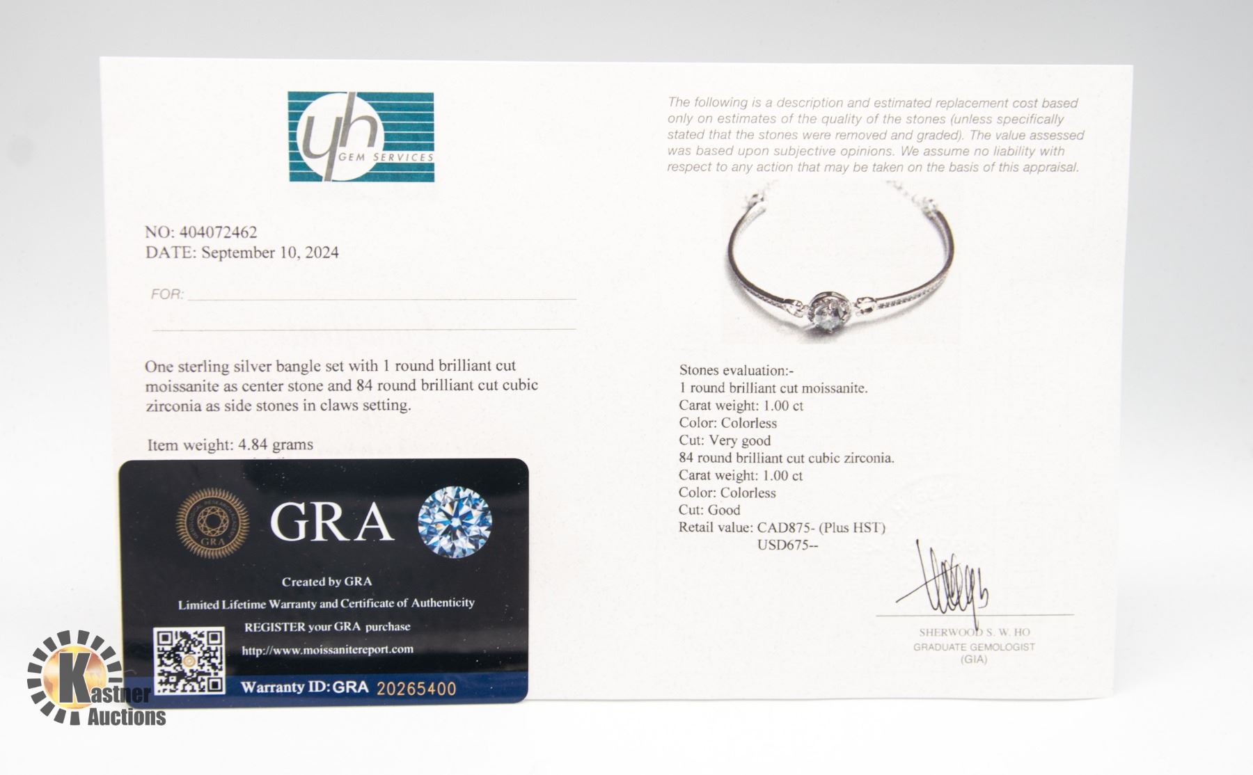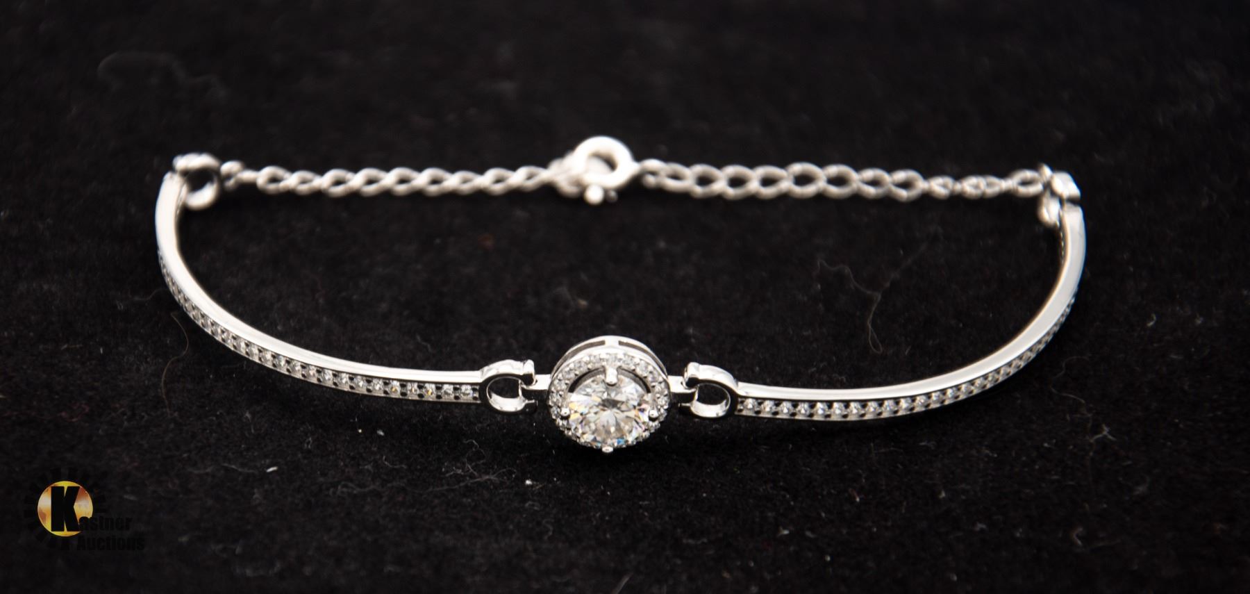 BRILLIANT CUT MOISSANITE STONE VVS D COLOR SET IN CENTER OF ROUND HALO WITH A TOTAL 84 ROUND BRILLIANT CUT CUBIC ZIRCONIA SET IN HALO AND BRACELET SET IN 925 SILVER RETAIL VALUE $875.00 **ALL ITEMS MUST BE REMOVED BY 5PM SATURDAY, DECEMBER 21ST 2024. ALL REMAINING ITEMS WILL BE SUBJECT TO A $6.00 PER DAY STORAGE CHARGE. ANY ITEMS REMAINING AFTER MONDAY, JANUARY 6TH 2025 WILL BE CONSIDERED FORFEITED. NO REFUNDS WILL BE ISSUED FOR FORFEITED ITEMS. TO SCHEDULE A PICK UP APPOINTMENT CLICK HERE