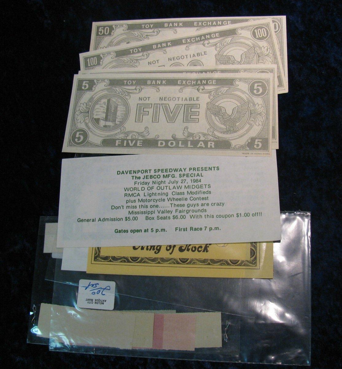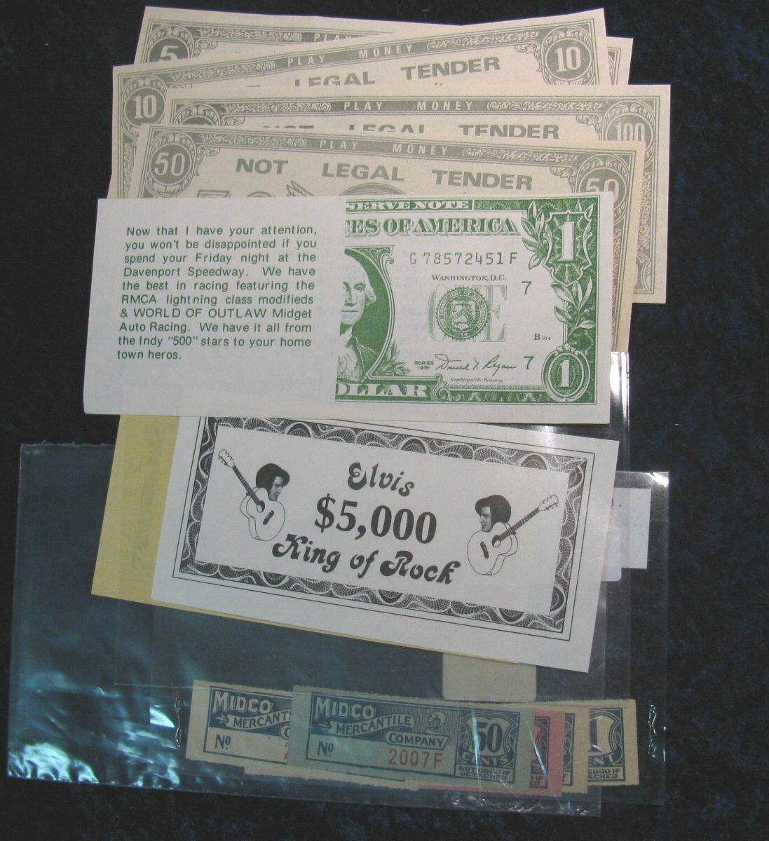 1427. (12) Pieces of old scrip including "Elvis $5,000 King of Rock".