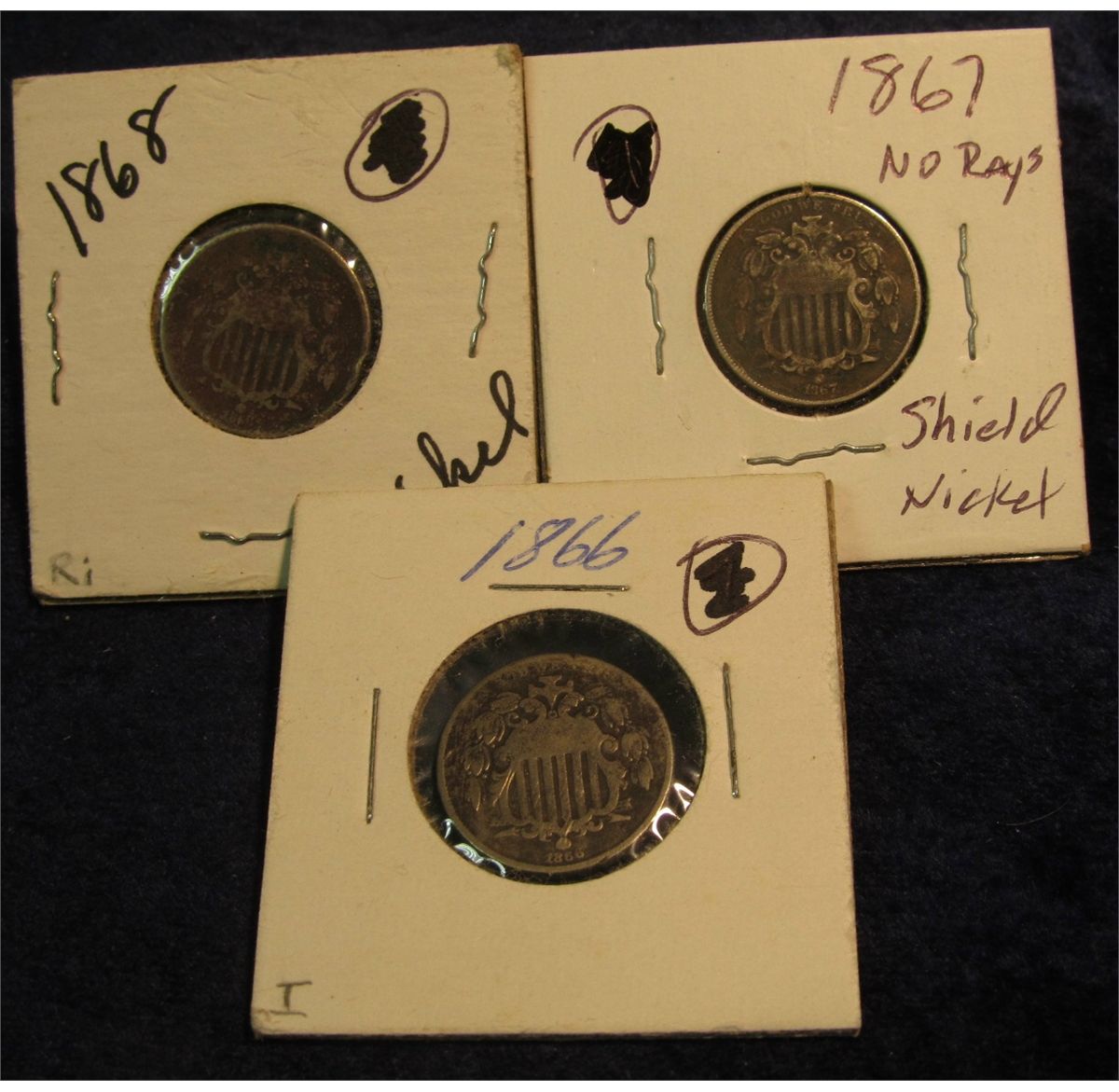 143. 1866 Rays, 67 No Rays, & 68 U.S. Shield Nickels. G-VG Redbook value $70.00.